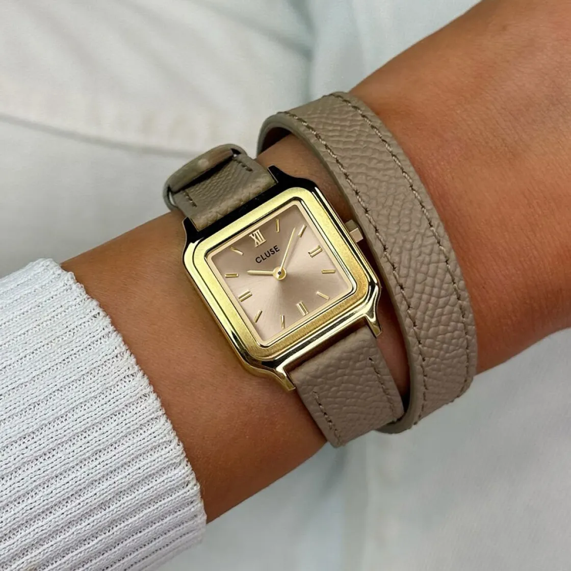 Montre de la collection Gracieuse Petite, mouvement quartz 2 aiguilles, cadran beige, boitier acier doré sur bracelet cuir beige double tour.