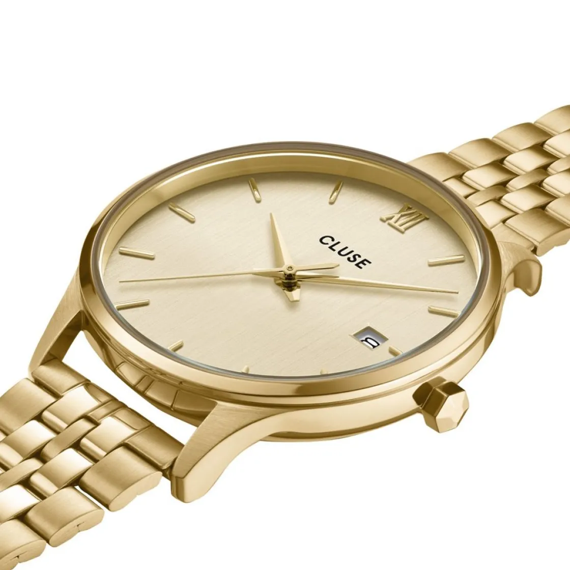 Montre de la collection Minuit, mouvement quartz 3 aiguilles, dateur à 3h, cadran doré, boitier acier doré sur bracelet acier doré.