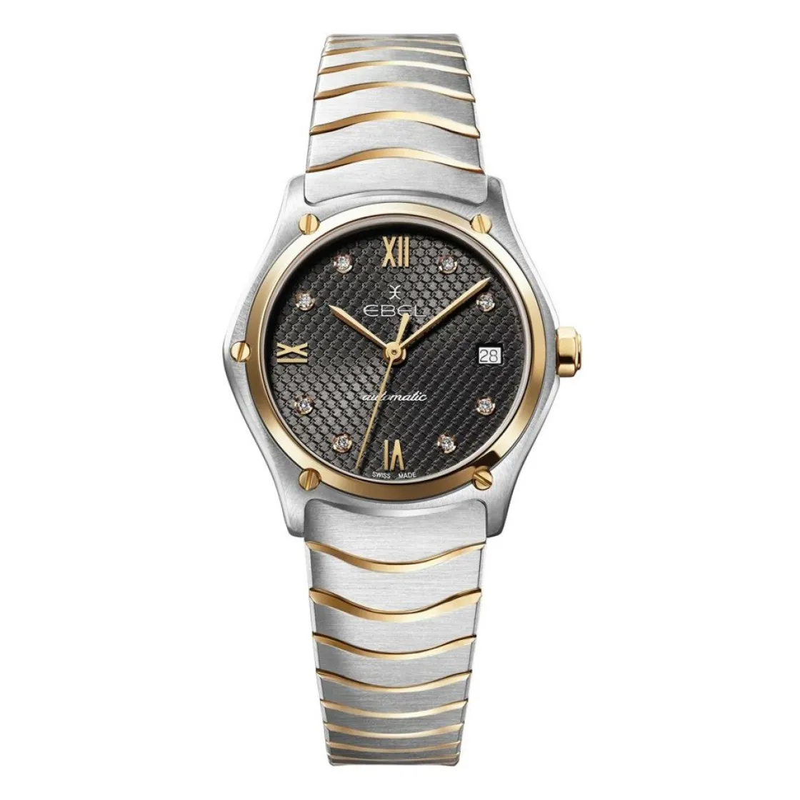 Montre de la collection Sport Classic, Acier inoxydable et boîtier en or rose 18 carats, cadran galvanique anthracite avec motif estampillé E kissing, chiffres romains plaqués or rose et 8 diamants (0,0512 ct), verre saphir avec traitement antireflet en dessous, bracelet à maillons ondulatoires bicolore en acier inoxydable et or rose avec boucle déployante, mouvement automatique suisse.
