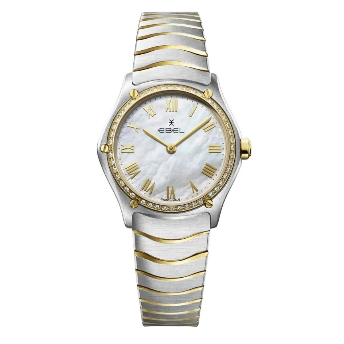 Montre de la collection Sport Classic, boîtier en acier inoxydable et or jaune 18 carats avec 47 diamants (0,3055 ct), cadran en nacre blanche avec chiffres romains appliqués, verre saphir avec traitement antireflet en dessous, bracelet à maillons ondulatoires en acier inoxydable bicolore avec boucle déployante, mouvement à quartz suisse.