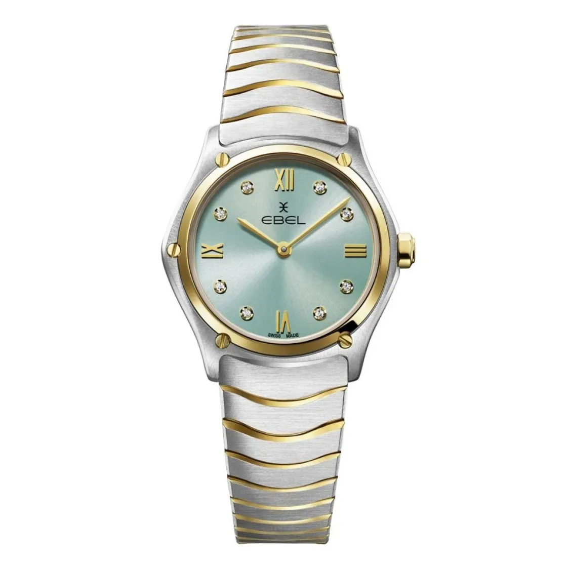 Montre de la collection Sport Classic, Acier inoxydable et boîtier en or jaune 18 carats, cadran galvanique bleu menthe avec chiffres romains plaqués or jaune et 8 diamants (0,0512 ct), finition brossée et polie, verre saphir avec traitement antireflet en dessous, bracelet à maillons ondulatoires bicolore en acier inoxydable avec boucle déployante, mouvement à quartz suisse.