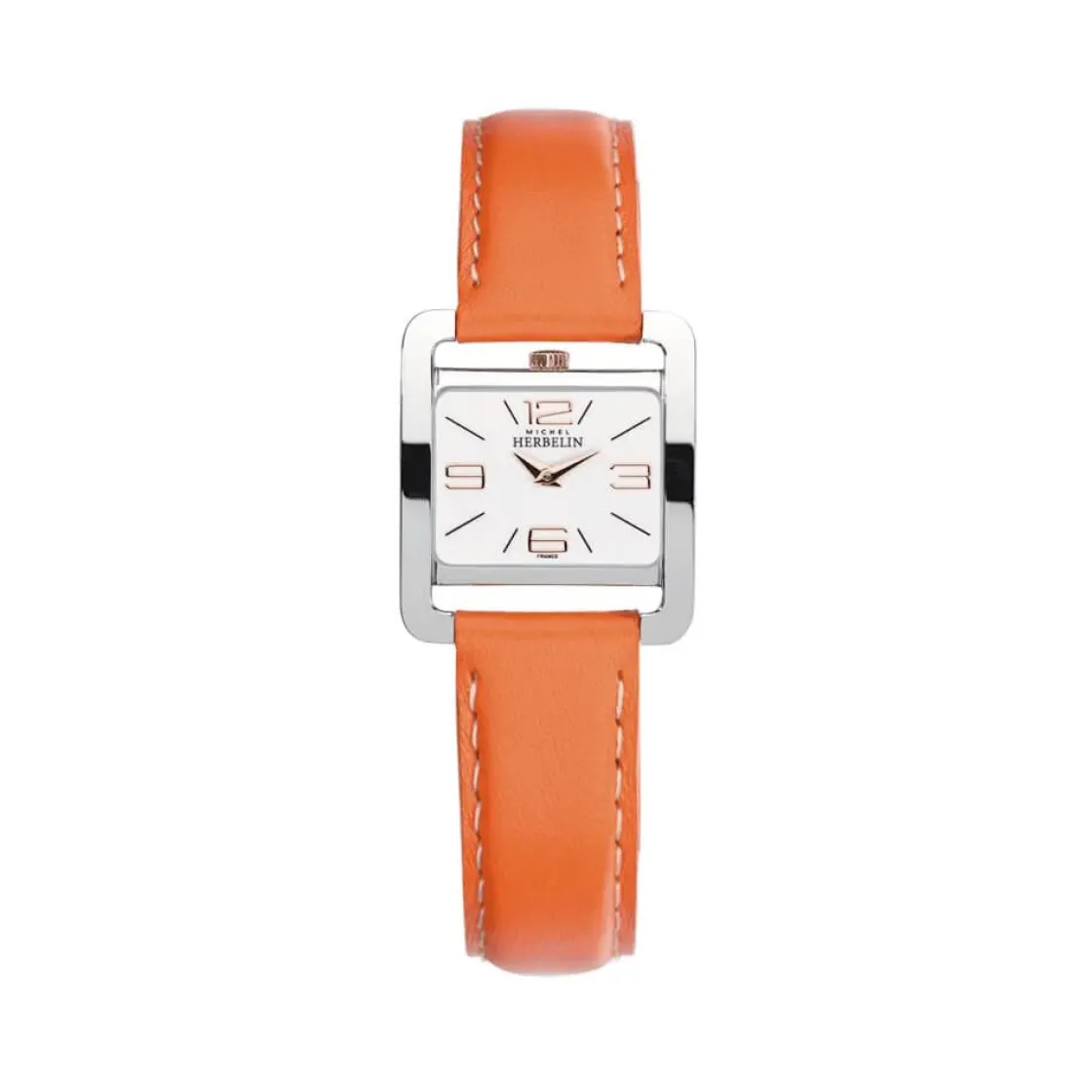 Montre de la collection V Avenue, mouvement suisse à quartz 2 aiguilles, verre saphir, cadran blanc, boitier acier sur bracelet cuir orange.