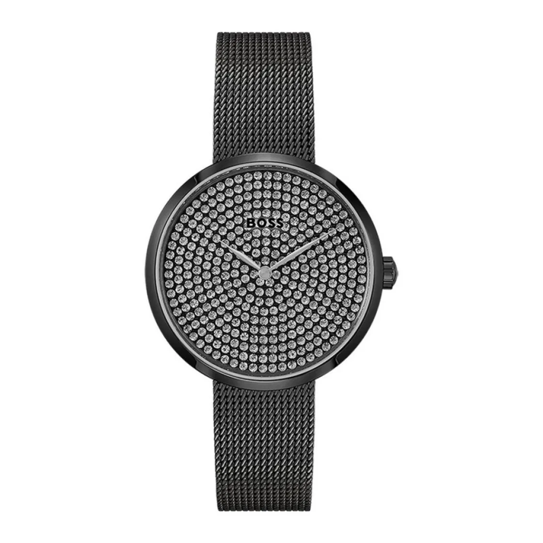 Montre de la collection Praise, mouvement quartz 2 aiguilles, cadran strass, boitier en acier noir sur bracelet acier noir en maille milanaise.