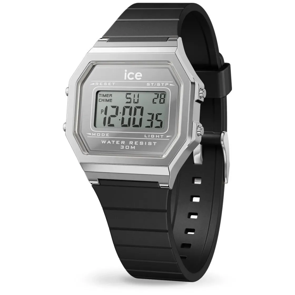 Montre de la collection Ice digit retro, mouvement quartz digital (chrono, alarme), cadran argenté , boitier acier sur bracelet silicone noir.