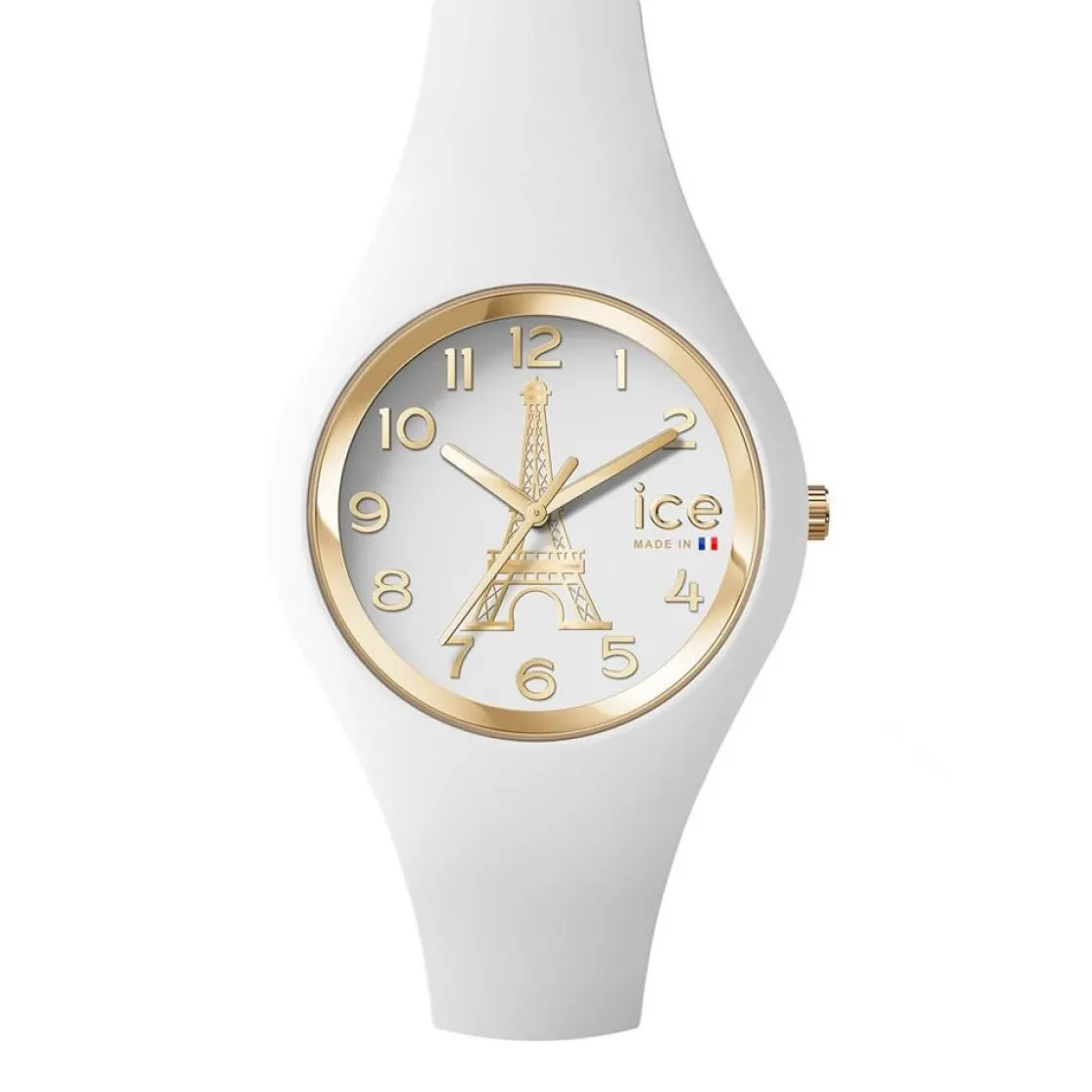 Montre de la collection Ice Cocorico, mouvement à quartz 3 aiguilles, cadran motif Tour Eiffel doré, boitier et bracelet silicone blanc.