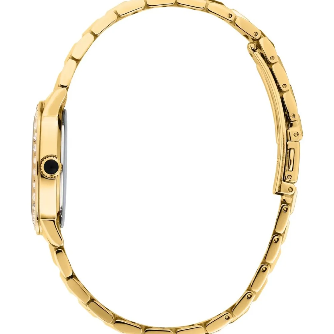 Montre de la collection Crystals, mouvement quartz 3 aiguilles, cadran noir, boitier acier doré orné de strass sur bracelet acier doré avec boucle déployante.