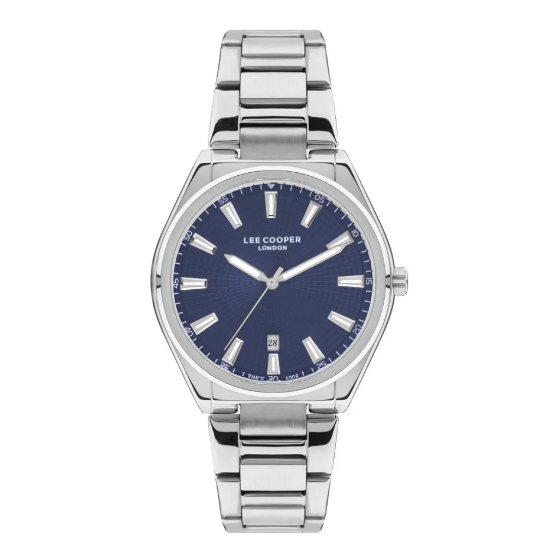 Montre Lee Cooper, mouvement quartz 3 aiguilles, dateur à 6h, cadran bleu, boitier métal sur bracelet métal avec bou…