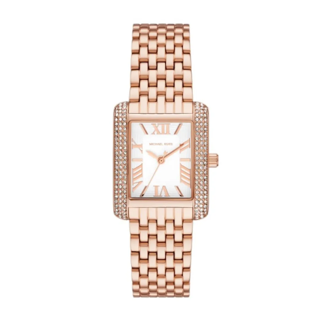 Montre de la collection Emery, mouvement quartz 3 aiguilles, cadran blanc, boitier acier doré rose orné de strass sur bracelet acier doré rose avec boucle déployante.