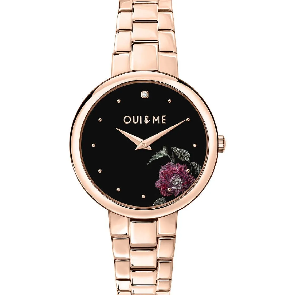 Montre de la collection Chérie, mouvement quartz 2 aiguilles, cadran noir, boitier en acier doré rose sur bracelet acier doré rose avec boucle déployante.