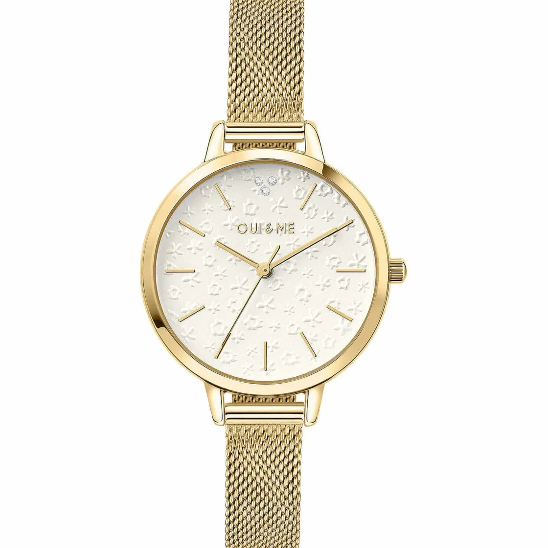Montre de la collection Fleurette, mouvement quartz 3 aiguilles, cadran doré, boitier en acier doré sur un bracelet acier doré en maille milanaise.