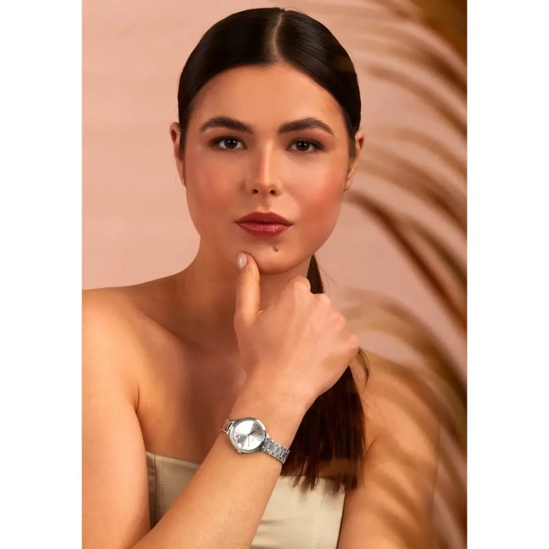 Montre de la collection Jolie, mouvement quartz 2 aiguilles, cadran argenté, boitier acier sur bracelet acier avec boucle déployante.