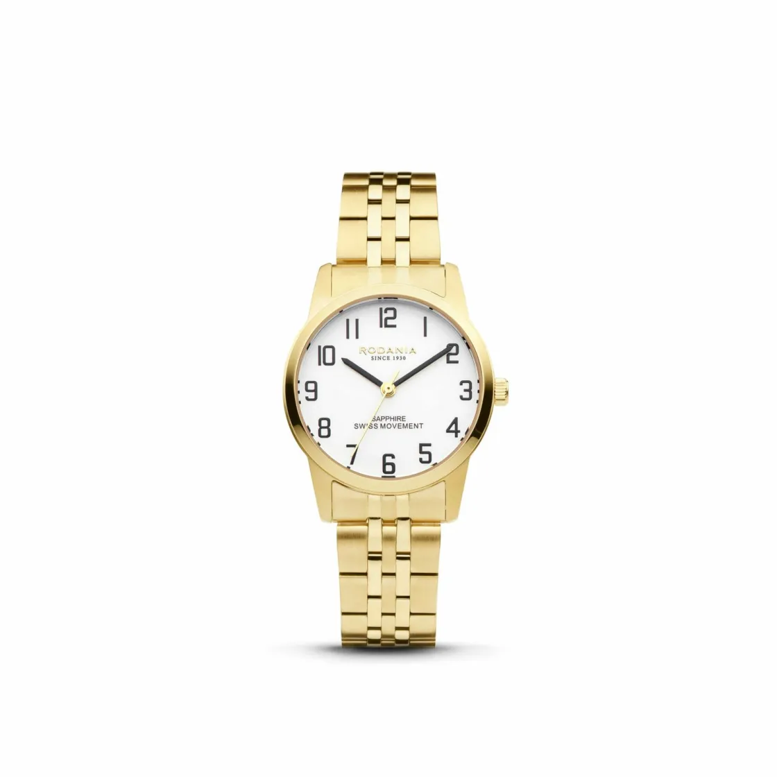 Montre de la collection Nyon Sport 30, mouvement suisse à quartz 3 aiguilles, cadran blanc, verre saphir, boitier en acier doré sur bracelet acier doré avec boucle déployante.