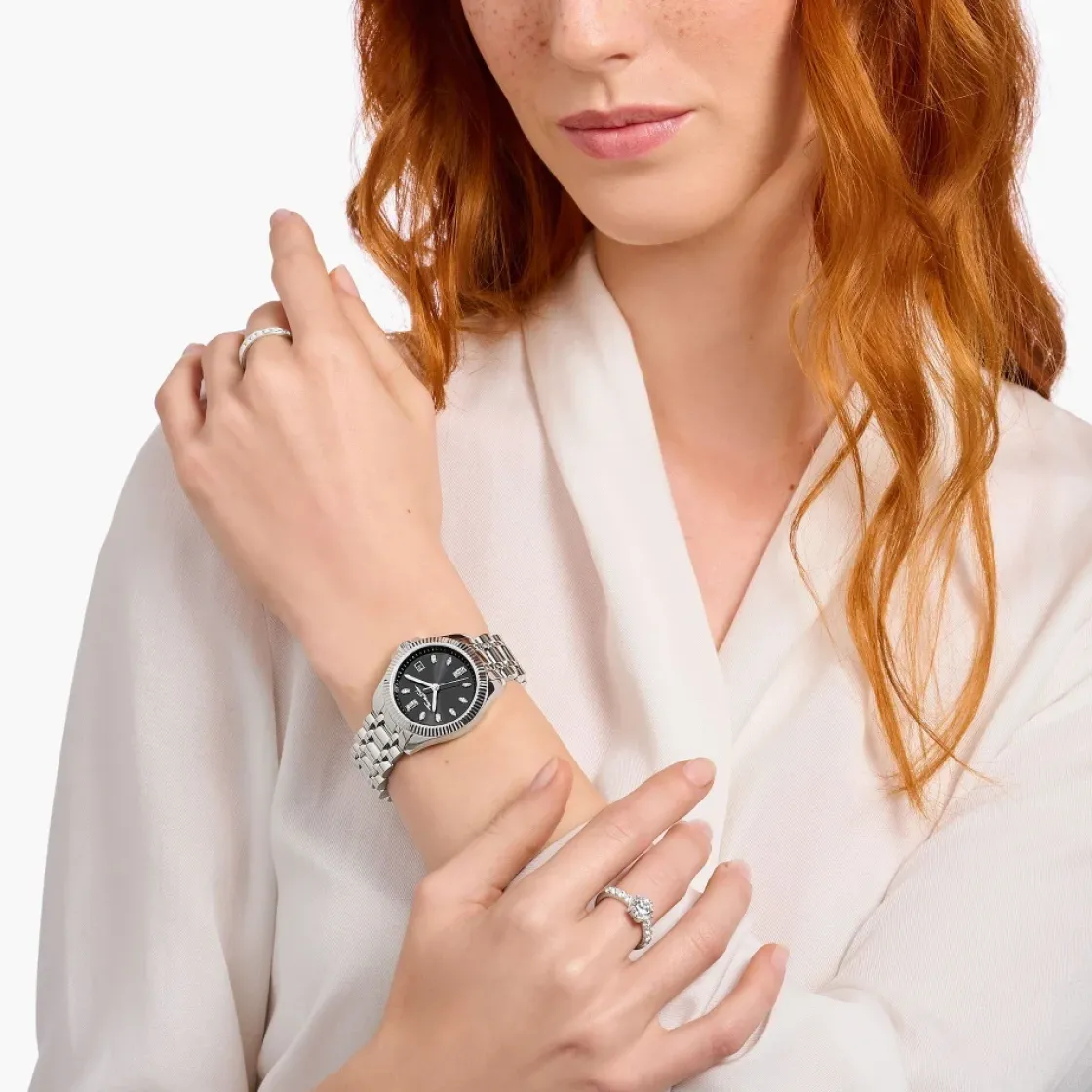 Montre de la marque Thomas Sabo, mouvement quartz 3 aiguilles, dateur à 3h, cadran noir, boitier acier sur bracelet acier avec boucle déployante.