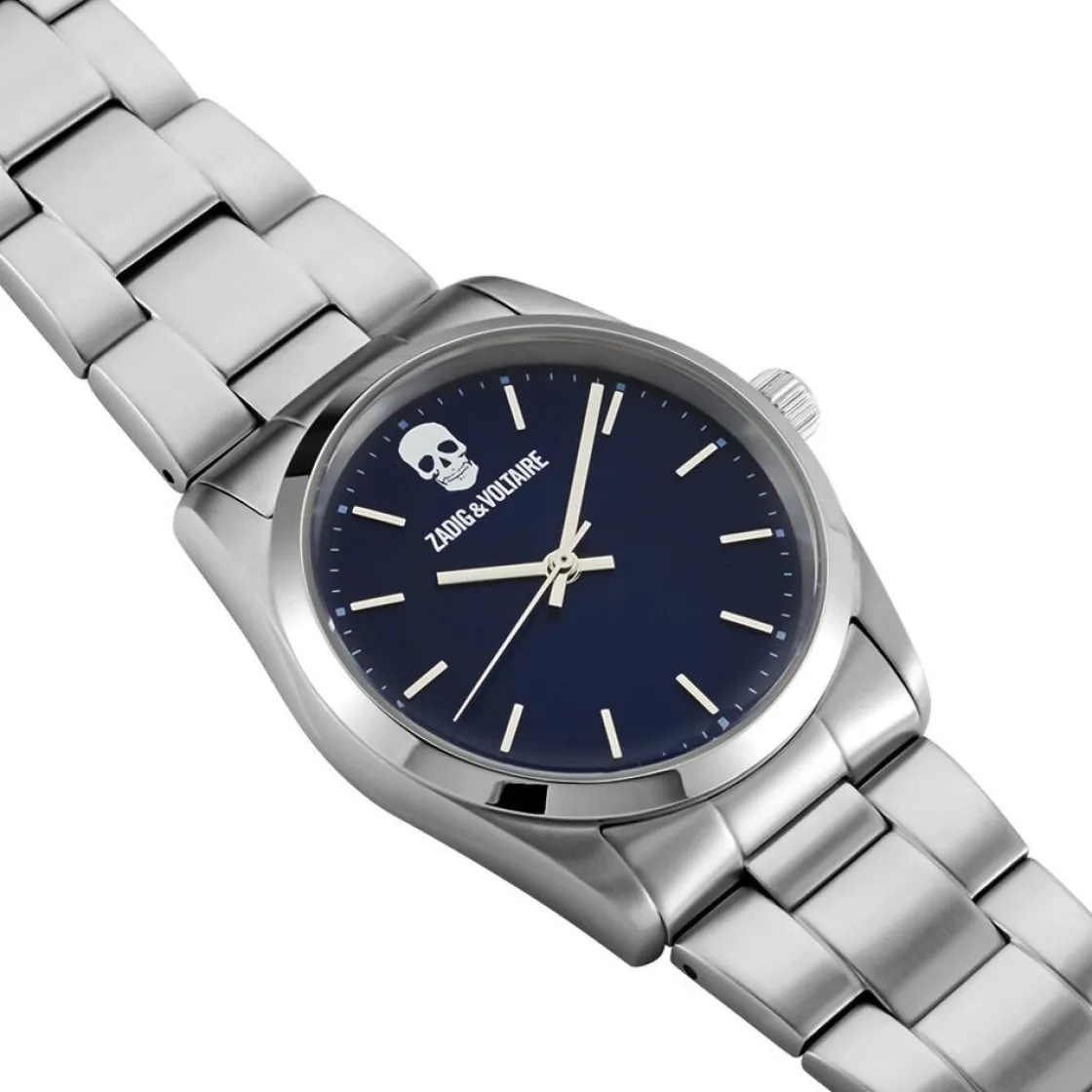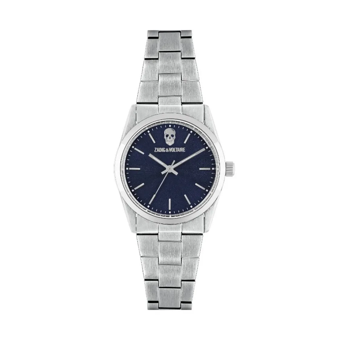 Montre Zadig et Voltaire, mouvement quartz 3 aiguilles, cadran bleu, boitier acier sur bracelet acier avec boucle déployante.