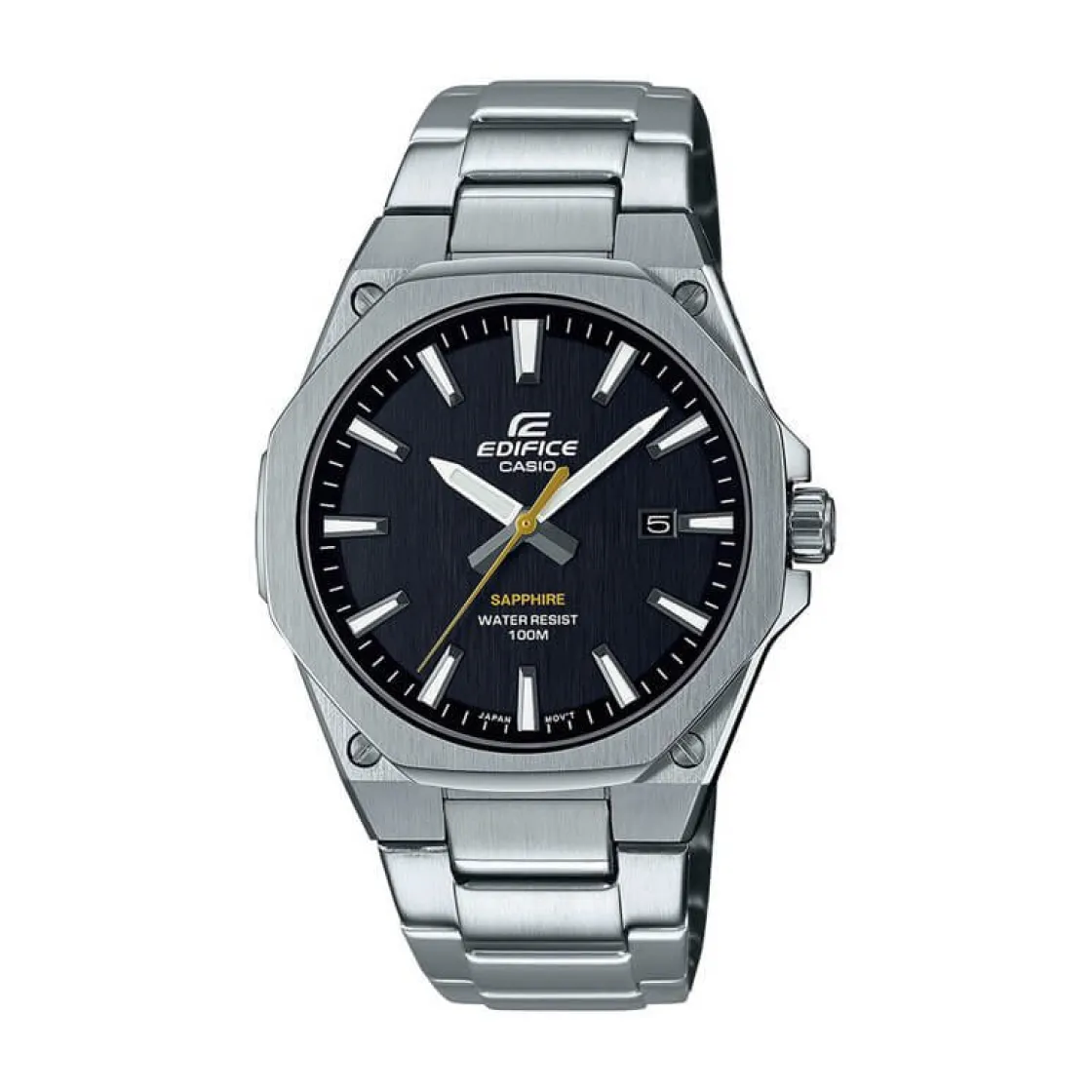 Montre de la collection Edifice Classic, mouvement quartz 3 aiguilles et dateur, boitier en acier avec un cadran noir sur bracelet acier boucle déployante. Verre saphir.