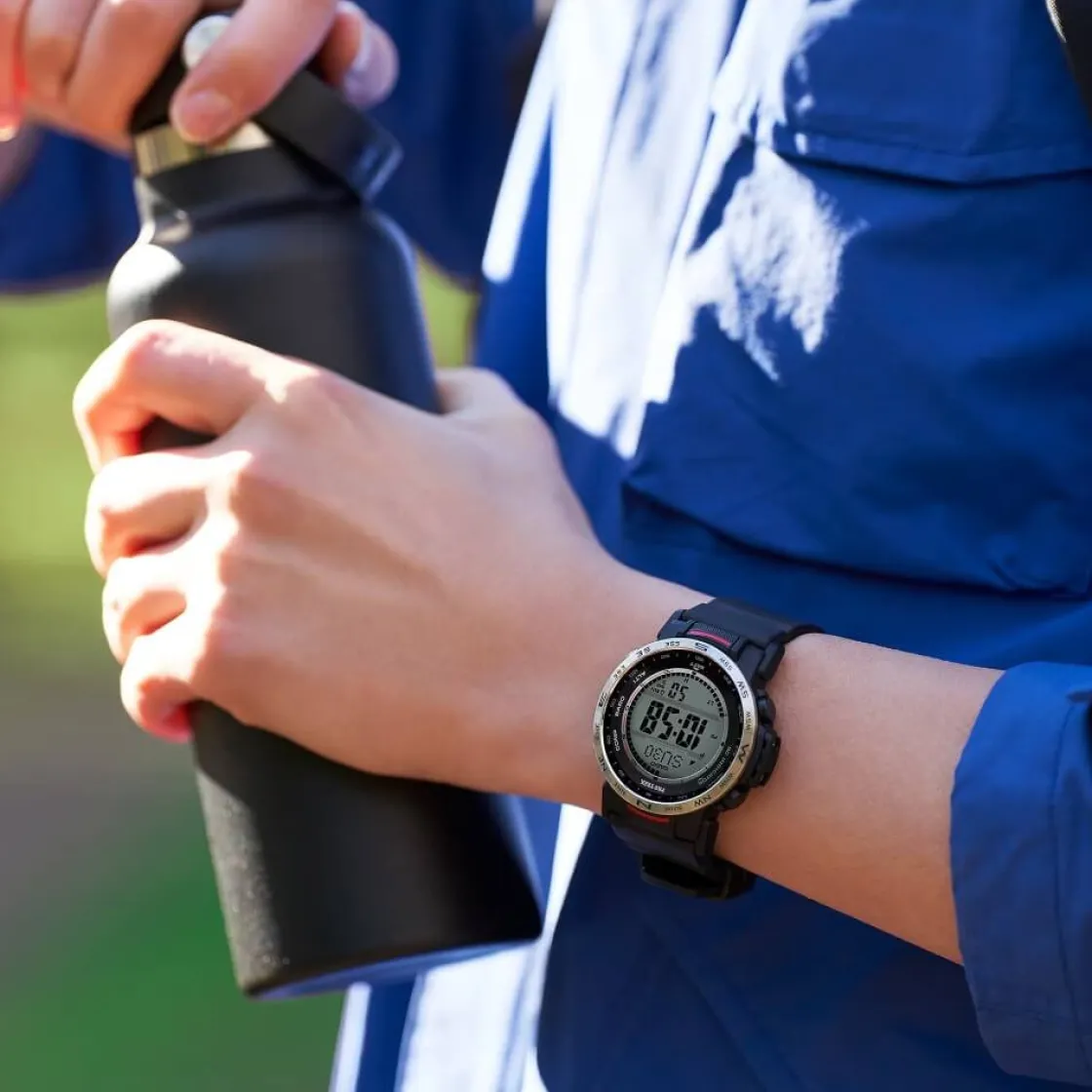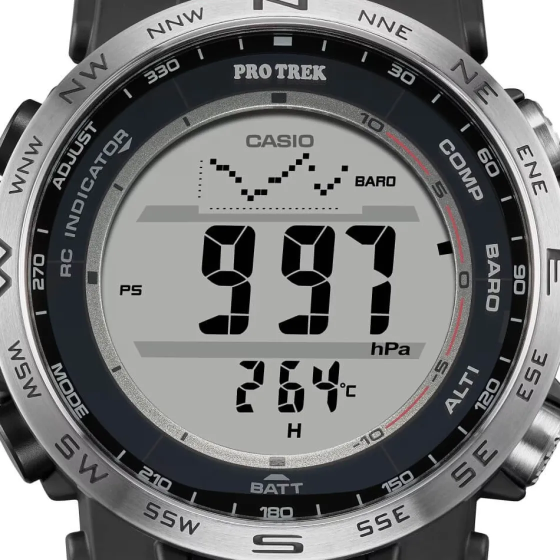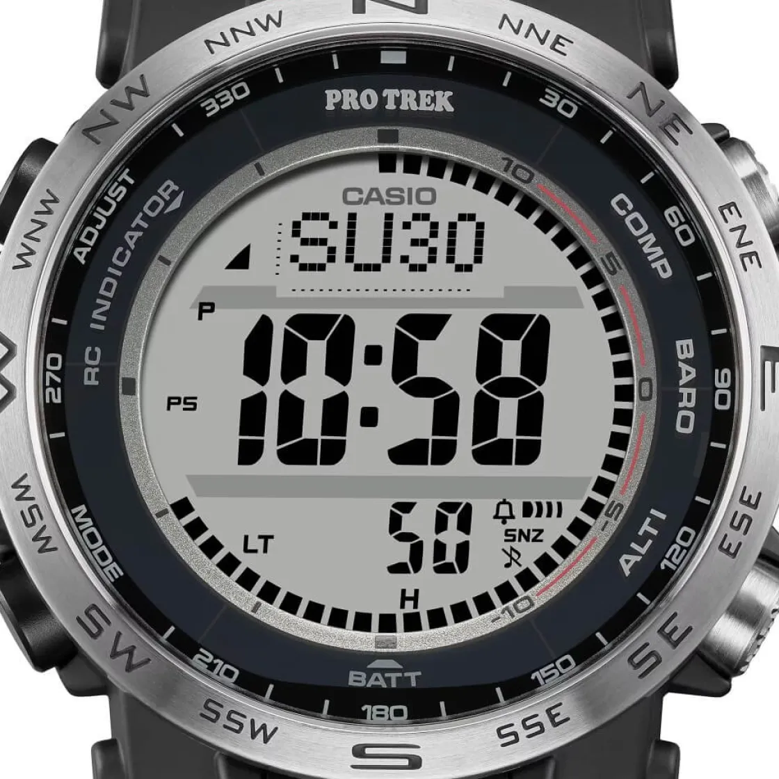 Cette montre est vraiment complète : elle offre des caractéristiques pratiques pour les activités en plein air en toute simplicité, tout en intégrant des matériaux choisis pour réduire l’impact sur l’environnement. Exprimez votre passion pour les grands espaces et votre attachement à l’environnement avec la PRW-35 numérique. Une simple pression sur l’un des trois grands boutons de fonction spécifiques permet d’obtenir les relevés du compas, de la pression barométrique, de la température et de l’altitude. La finition moletée antidérapante permet une utilisation plus intuitive et plus précise des boutons, même avec des gants.