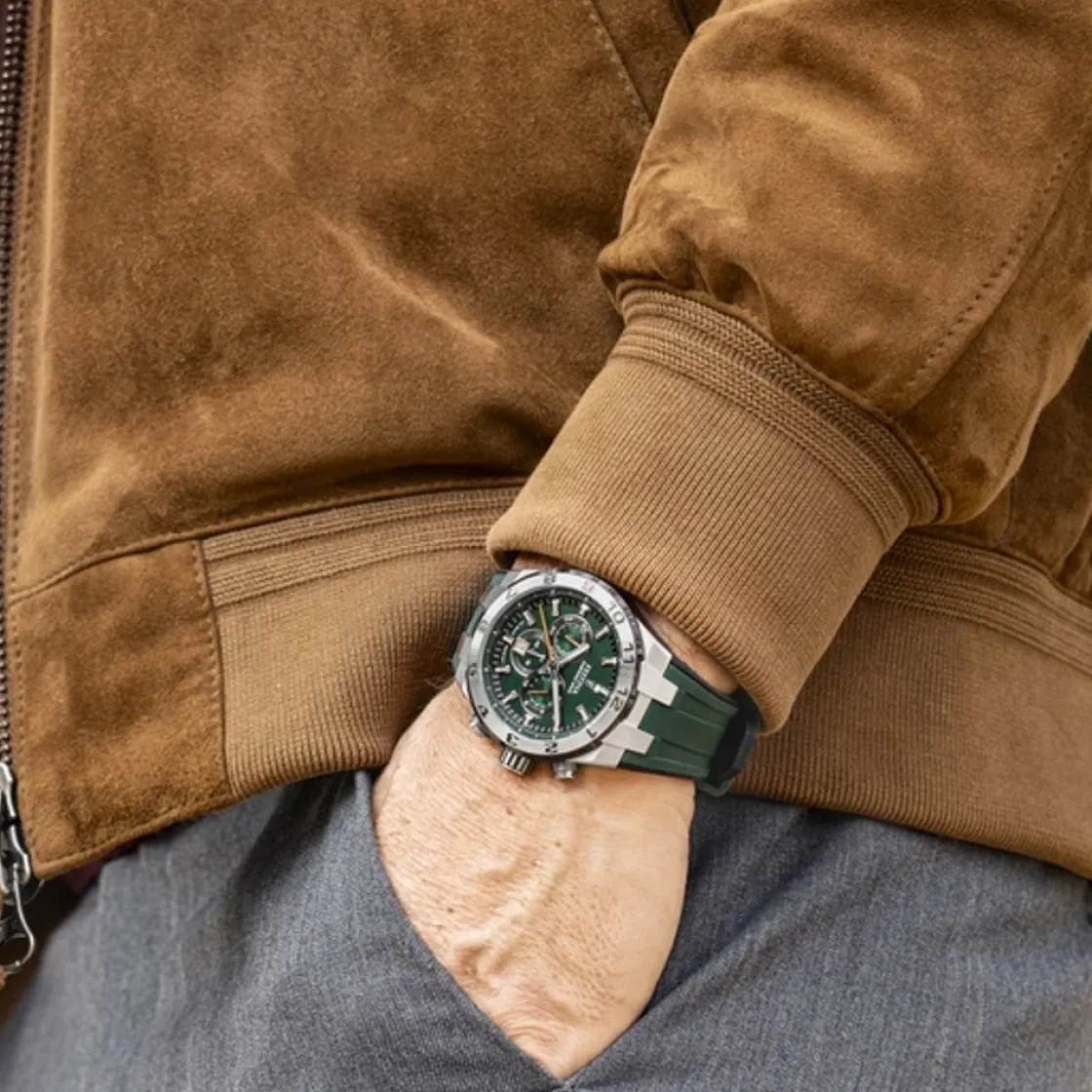 Montre de la collection Chrono Bike, mouvement quartz chronographe, dateur à 6h, cadran vert, boitier acier sur bracel…