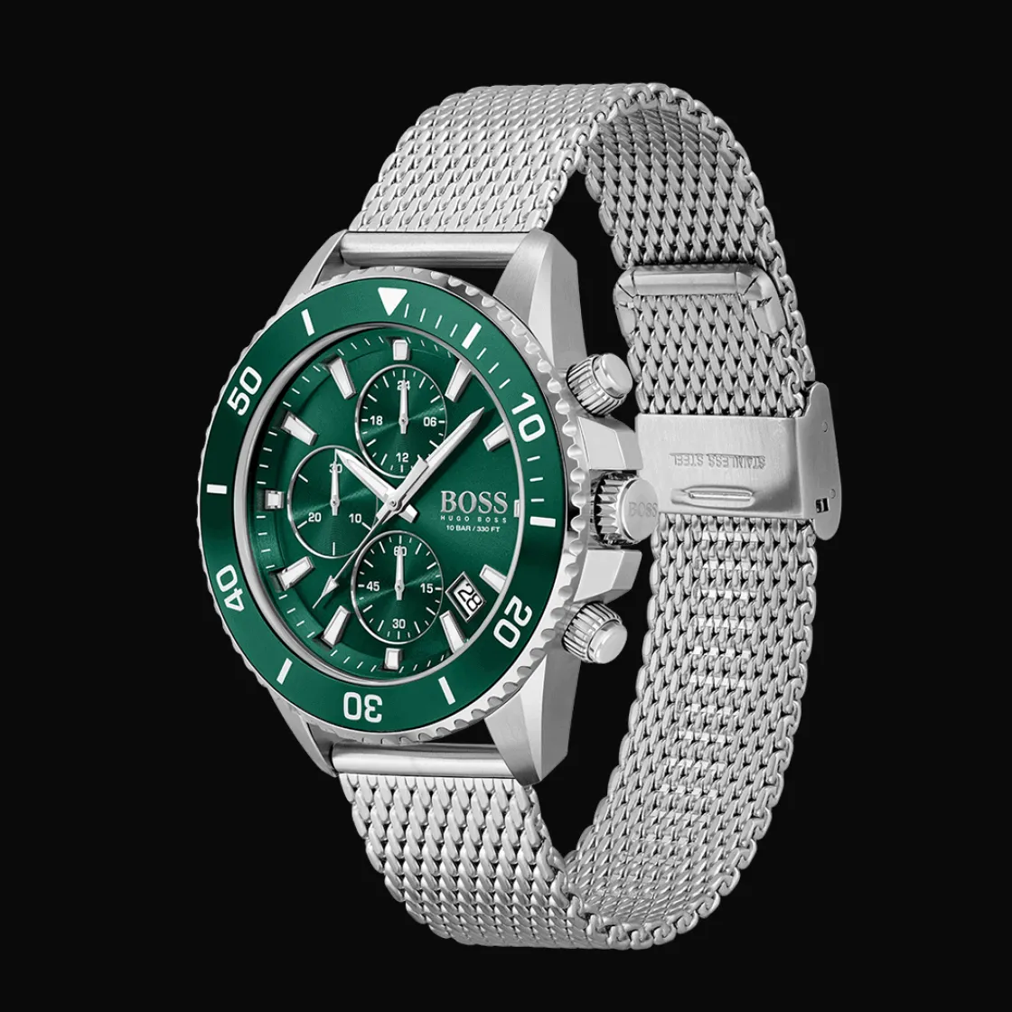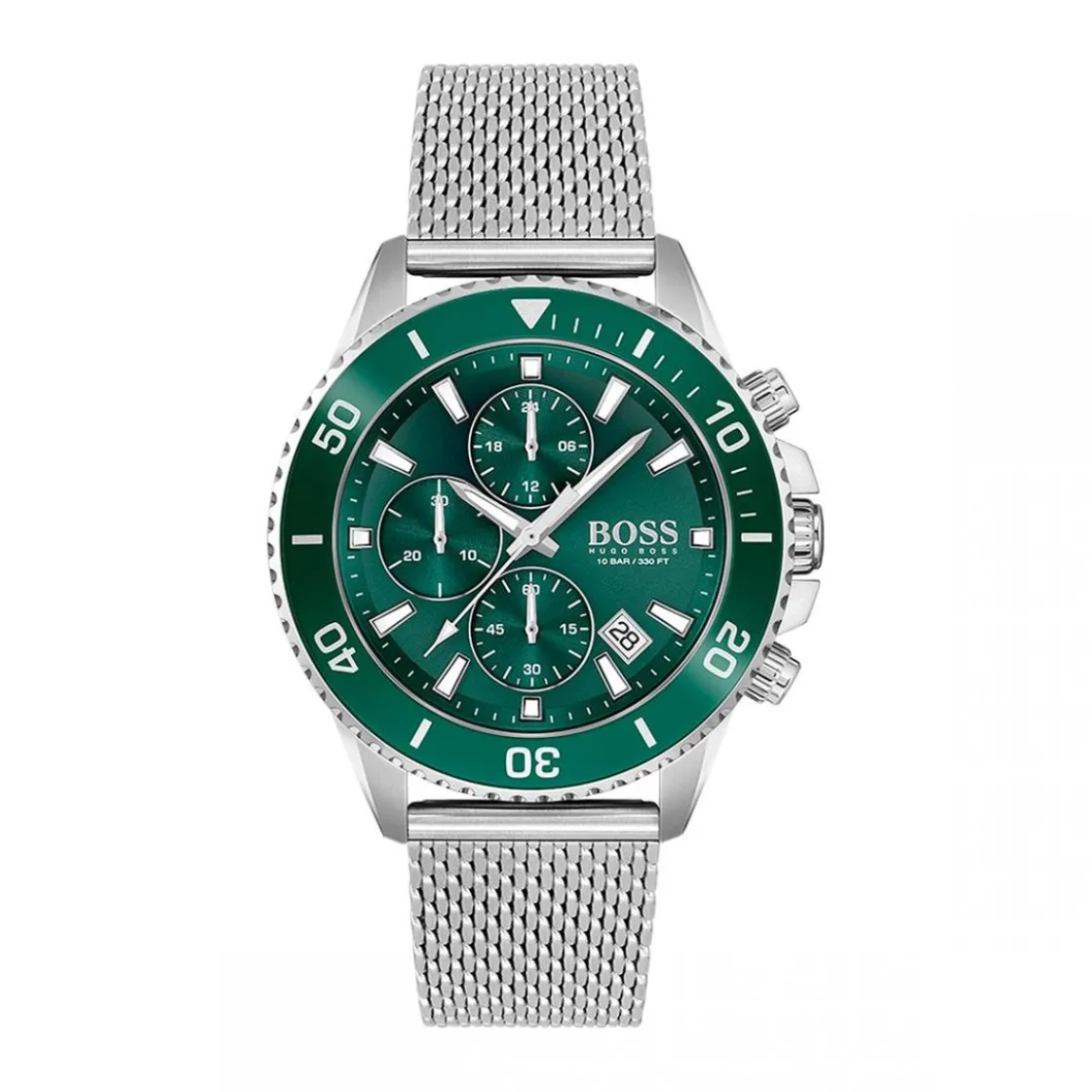 Montre de la collection Admiral, mouvement quartz chronographe, dateur à 4h, cadran vert, boitier acier sur bracelet milanais acier.