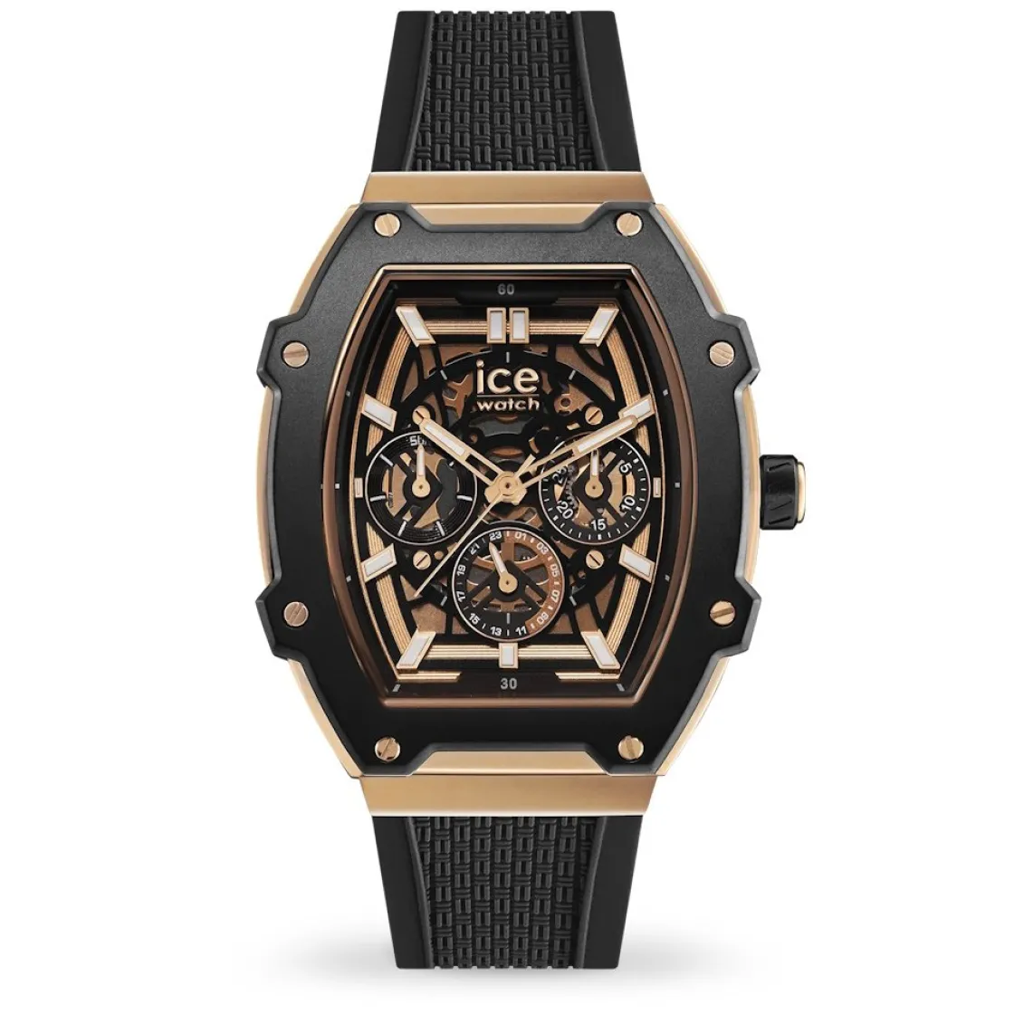 Montre de la collection Ice Boliday, mouvement quartz multifonctions, cadran doré rosé et noir, boitier acier doré rosé sur bracelet silicone noir.