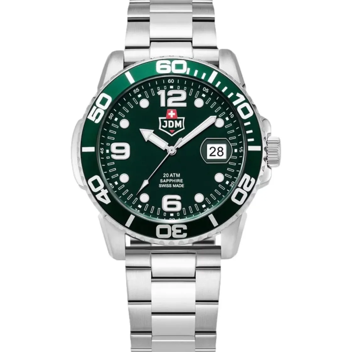 Montre de la collection Mike, mouvement suisse quartz 3 aiguilles, dateur à 3h, verre saphir, cadran vert, boitier acier sur bracelet acier avec boucle déployante.