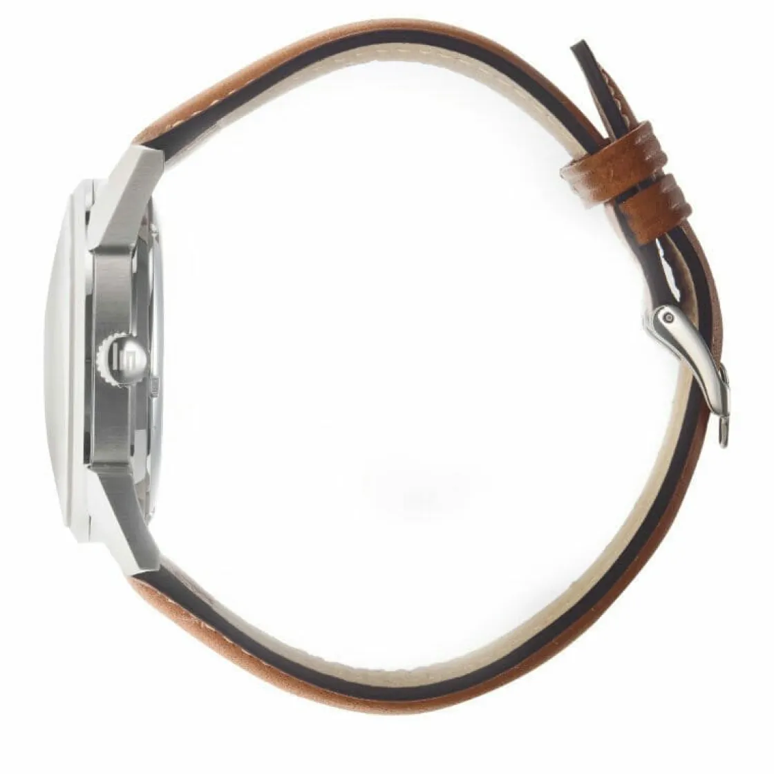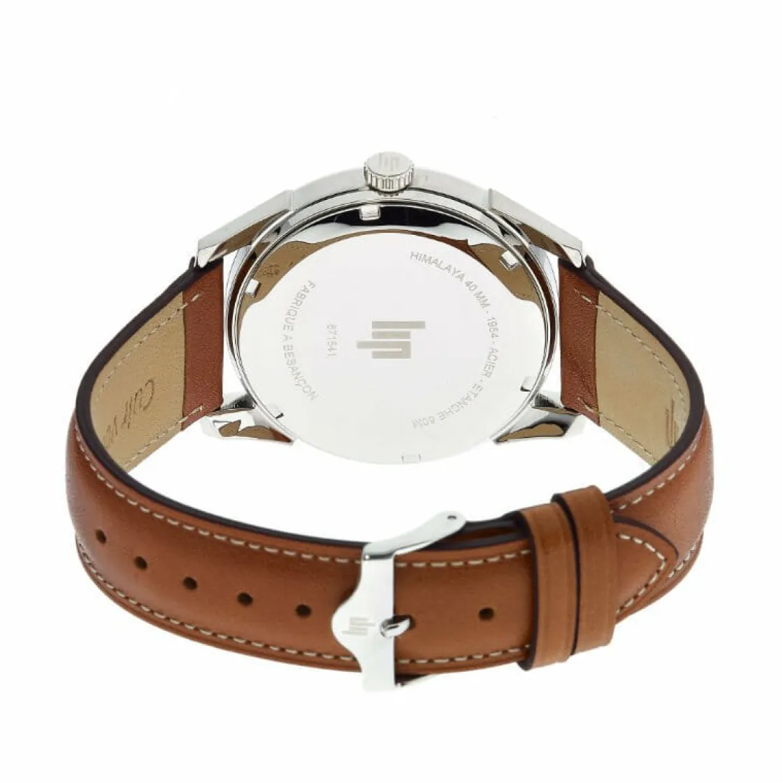 Montre de la collection Himalaya, mouvement quartz 3 aiguilles, cadran bleu, boitier en acier sur bracelet cuir marron.