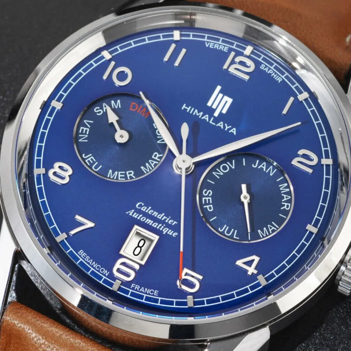Montre de la collection Himalaya, mouvement automatique 3 aiguilles avec complication, dateur à 6h, verre saphir, cadran bleu, boitier acier sur bracelet cuir marron avec boucle déployante.