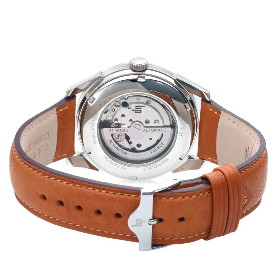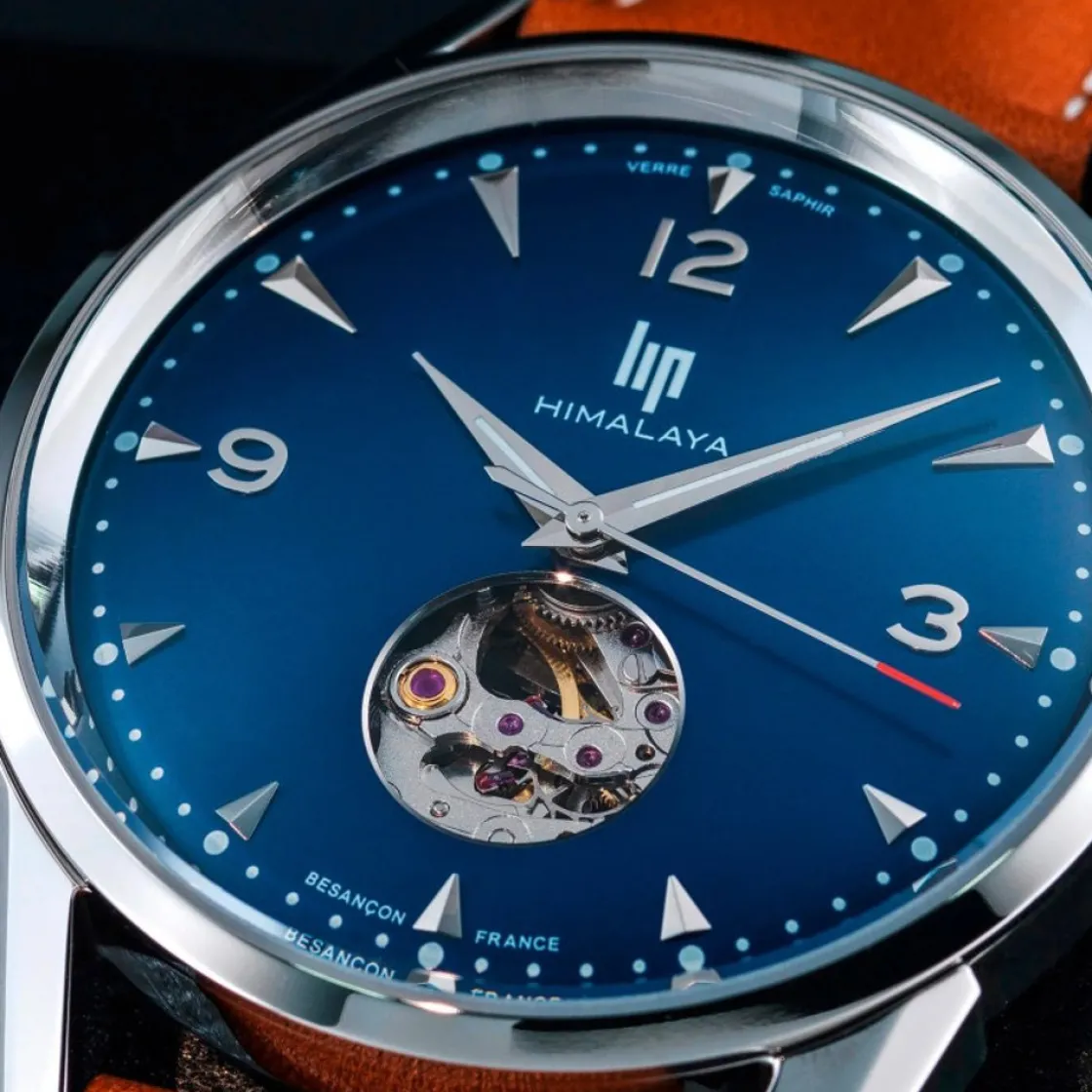 La fiabilité et la résistance du modèle Lip Himalaya ont fait sa renommée. L’Himalaya, garde-temps à l’élégance intemporelle, vit désormais au rythme d’un mouvement automatique. Le cœur battant permet d’admirer la mesure du temps qui passe avec précision et élégance. Le boîtier en acier inoxydable 316L poli et brossé est plus imposant que lors de son lancement en 1954, il mesure à présent 40 mm de diamètre et offre un fond transparent vissé, permettant d’admirer le mécanisme automatique embarqué. Le cadran bleu, finition mat dévoile des index triangulaires argentés et des aiguilles des heures et des minutes argentées en partie luminescentes, il est recouvert par un verre saphir traité antireflet. Le compteur des petites secondes à 4h présente une aiguille argentée. Le cœur ouvert est visible à 7h, il permet également de contempler le mécanisme automatique de la montre. Un bracelet en cuir de vachette lisse de couleur camel avec surpiqûres blanches accompagne ce garde-temps d’exception, il est muni d’une boucle ardillon. Ce modèle est étanche à 50 m, il accompagnera chacune de vos tenues et apportera une touche vintage.