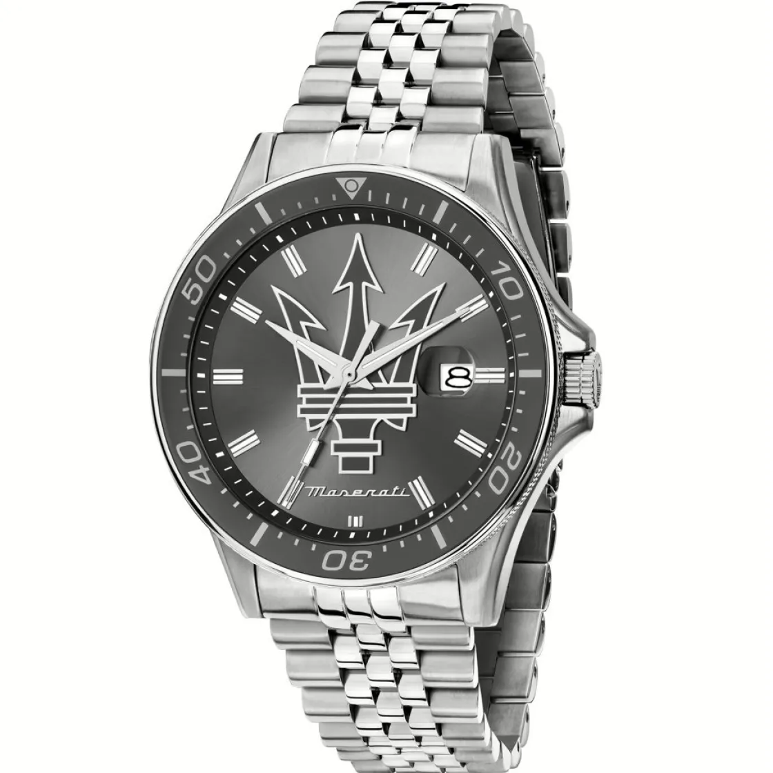 Montre de la collection Sfida, mouvement quartz 3 aiguilles, dateur à 3h, cadran gris, boitier acier sur bracelet acier.