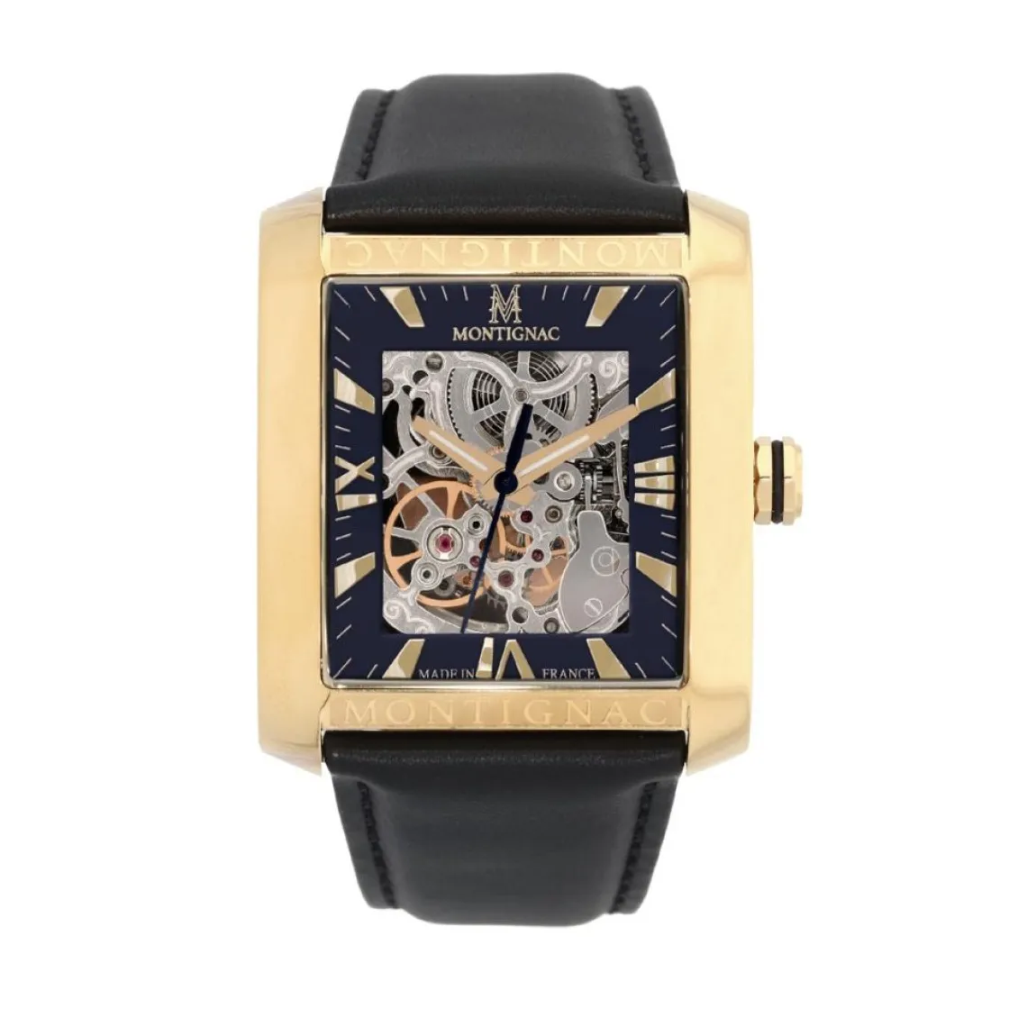 Montre Montignac, mouvement automatique , cadran noir, boitier acier doré sur bracelet cuir noir.