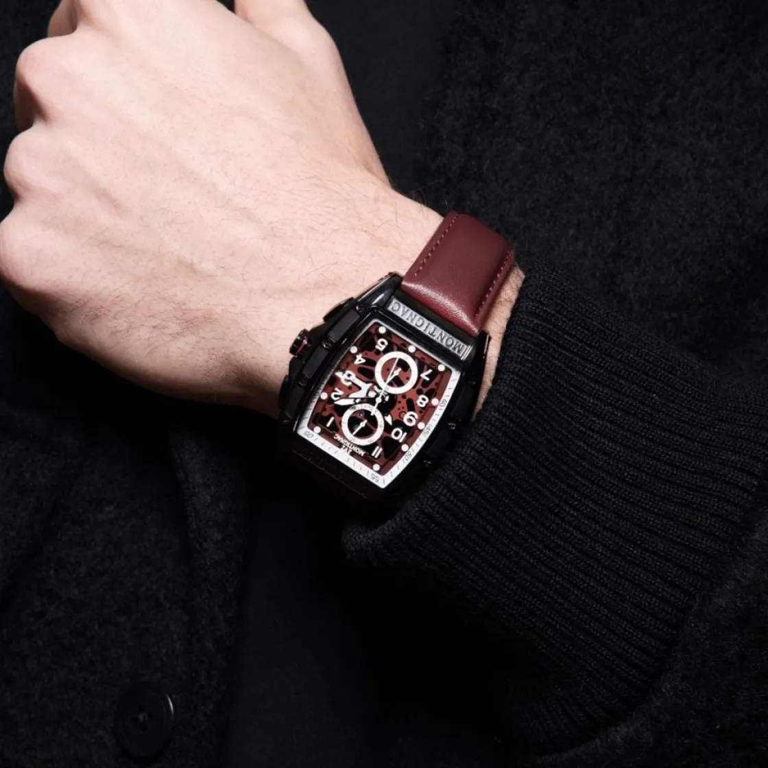 Montre à mouvement quartz chronographe, dateur à 3h, cadran noir et rouge, boitier acier noir sur bracelet cuir rouge.