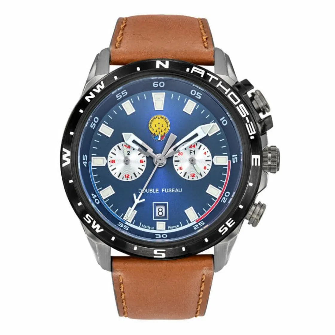 Montre de la collection Athos3, mouvement quartz multifonctions, dateur à 6h, cadran bleu, boitier acier sur bracelet cuir brun.