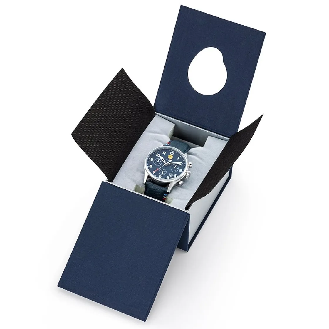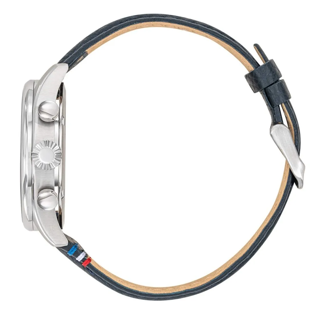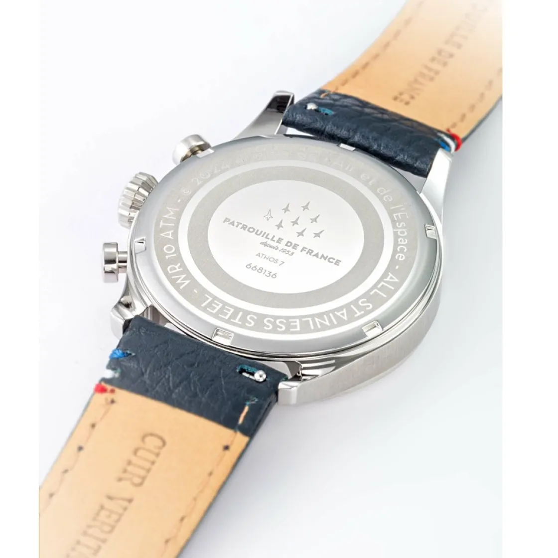 Montre de la collection Athos 7, mouvement quartz chronographe, dateur à 4h, cadran bleu, boitier en acier sur bracelet cuir bleu.