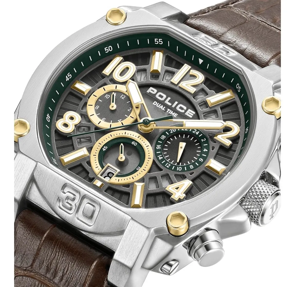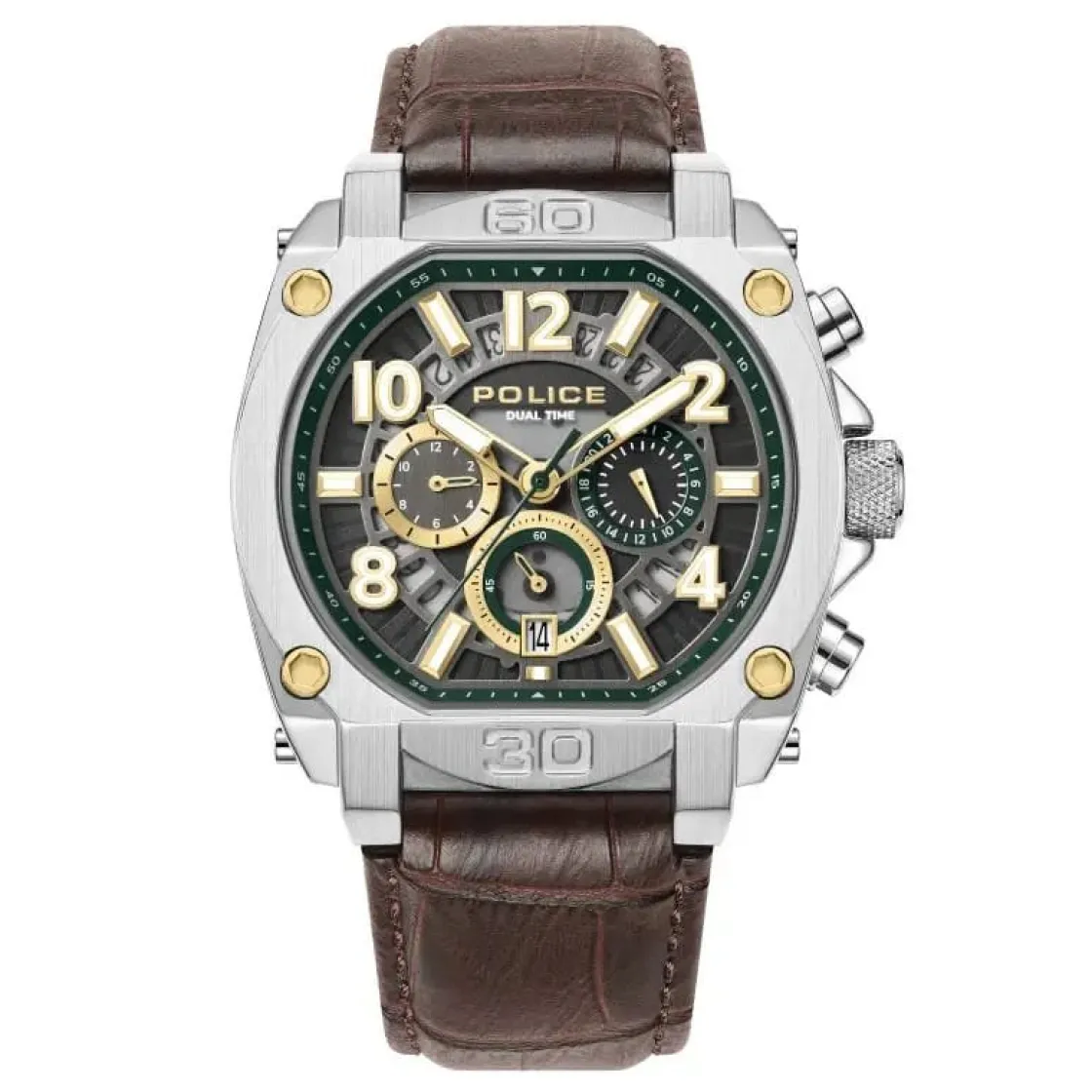 Montre de la collection Norwood , mouvement à quartz 3 aiguilles multifonction, dateur à 6h, cadran gris, boitier en acier sur bracelet cuir marron.