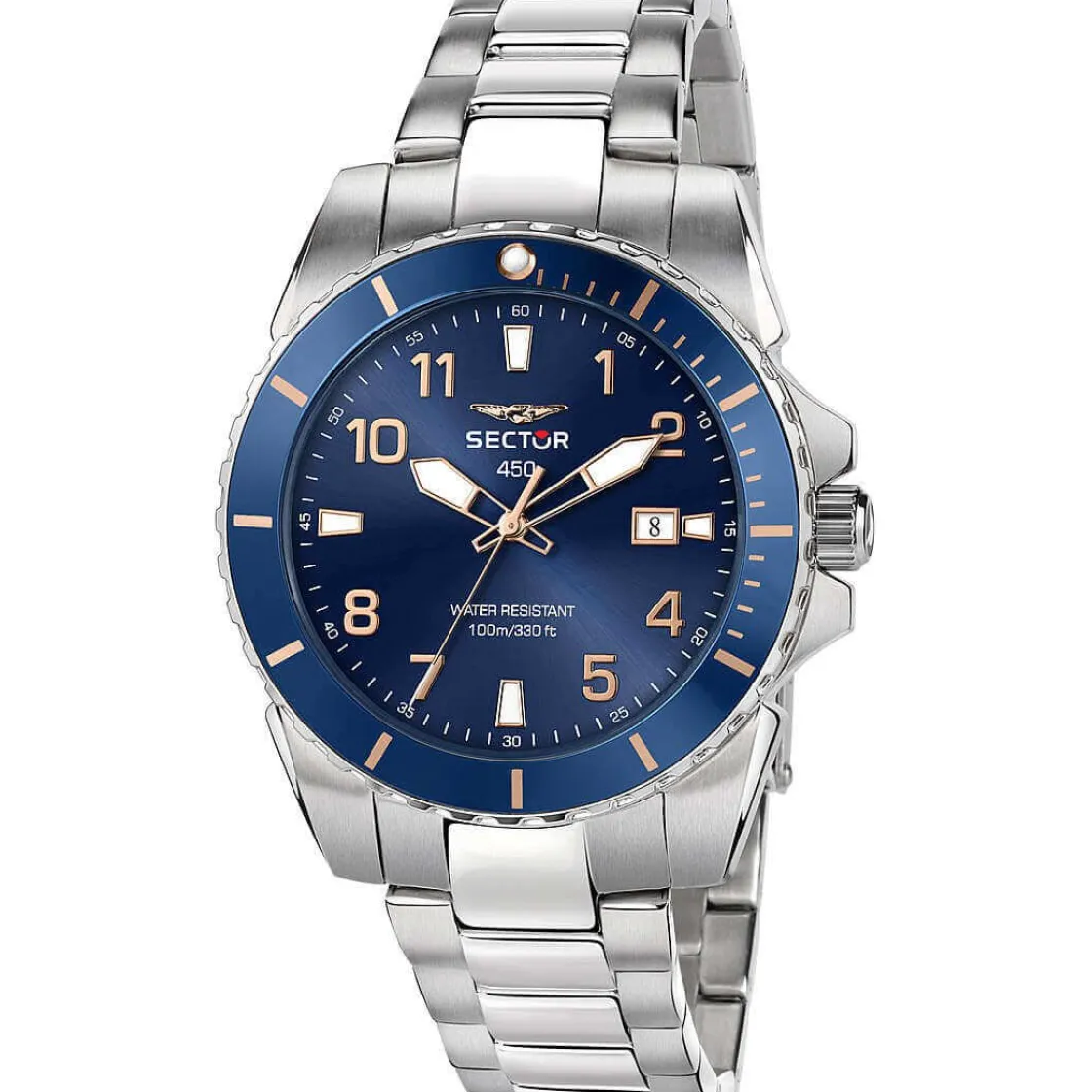 Montre de la collection 450, mouvement quartz 3 aiguilles, dateur à 3 h, cadran bleu, boitier en acier sur bracelet acier avec boucle déployante.