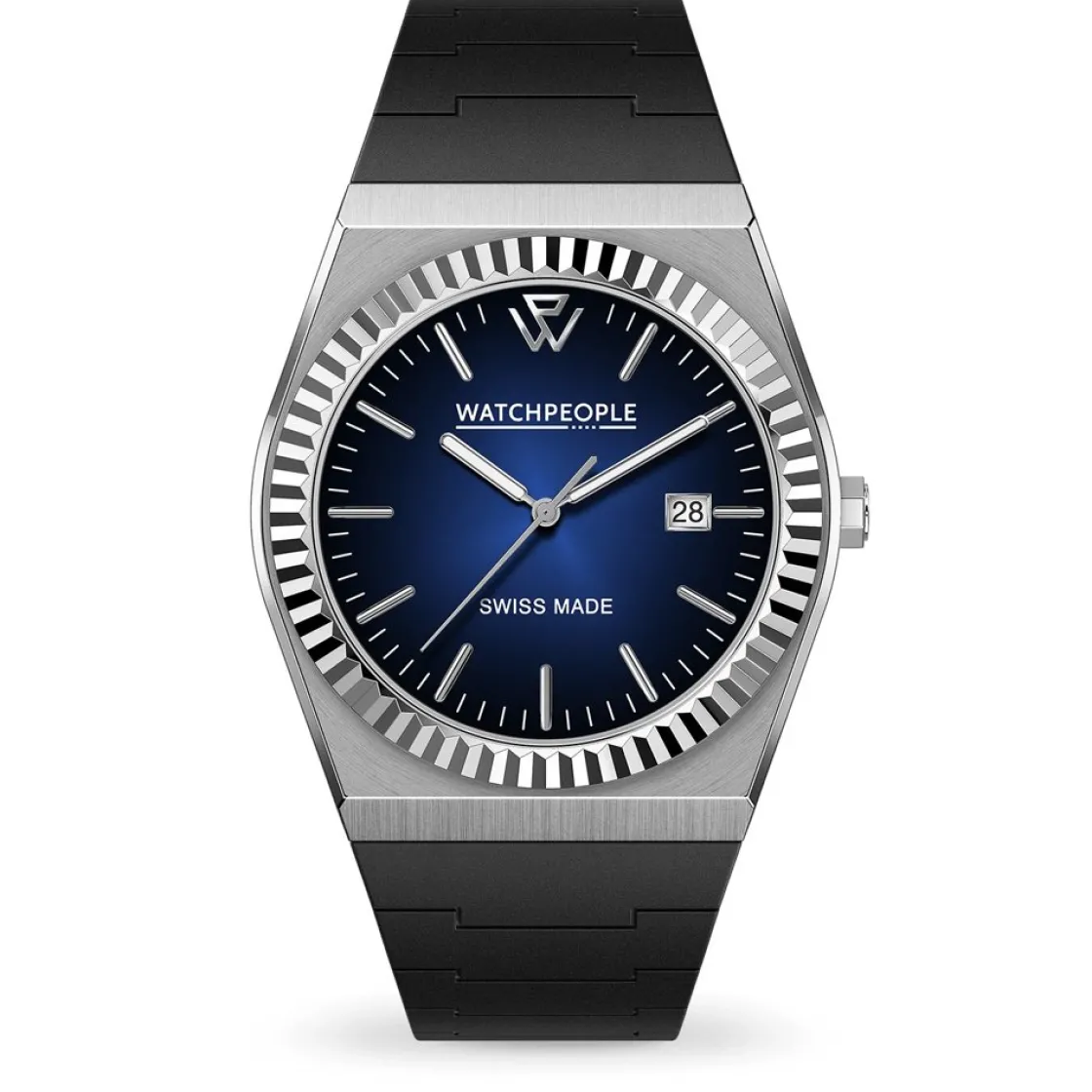 Montre de la collection WP1, mouvement quartz suisse 3 aiguilles, dateur à 3h, verre saphir, cadran bleu, boitier acier sur bracelet silicone noir.