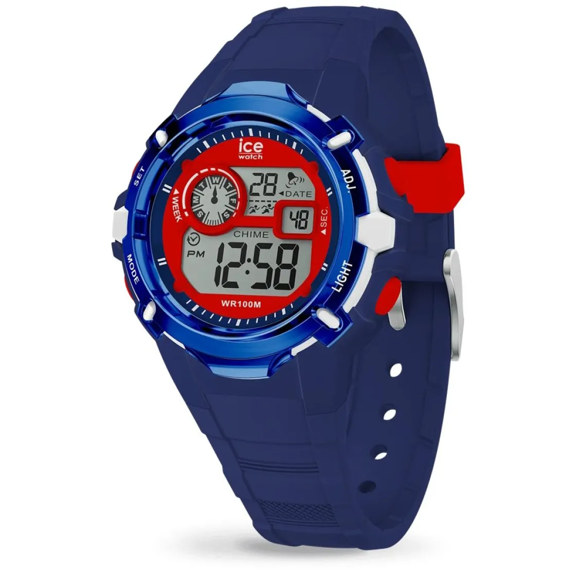 Montre de la collection Ice Digi Explorer, mouvement quartz, affichage digital, boitier et bracelet silicone bleu et rouge.