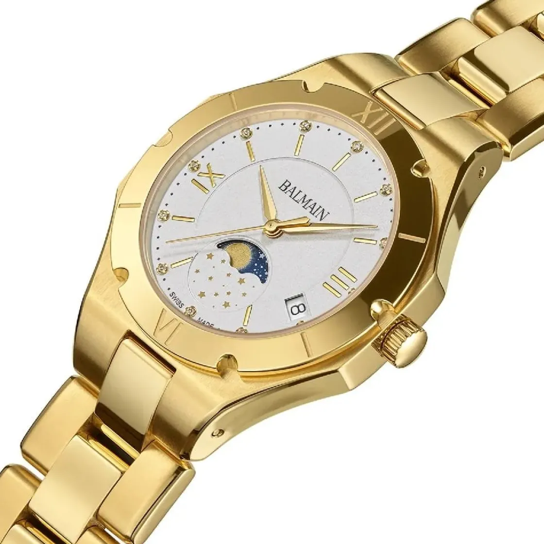 Montre de la collection Be Balmain, mouvement quartz suisse 3 aiguilles , verre saphir, dateur à 4h, cadran blanc serti de 12 diamants, boitier acier doré sur bracelet acier doré avec boucle déployante.