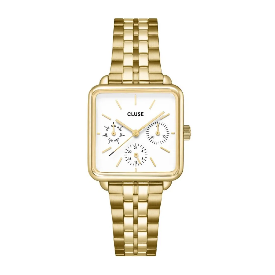 Montre de la collection La Tétragone, mouvement quartz multifonctions, cadran blanc, boitier acier doré sur bracelet acier doré.