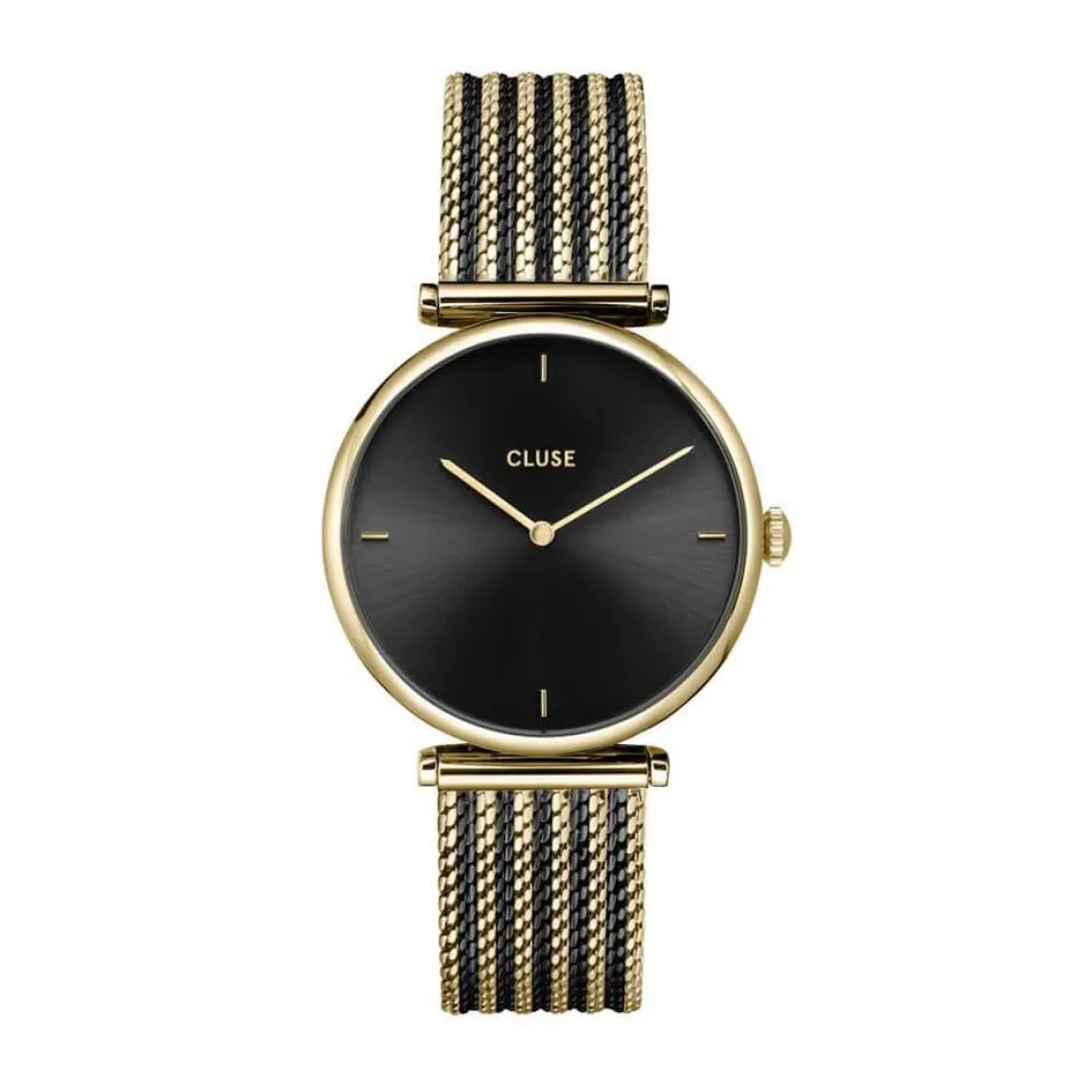 Montre de la collection Triomphe, mouvement quartz 2 aiguilles, cadran noir, boitier acier doré sur bracelet acier bicolore en maille milanaise.