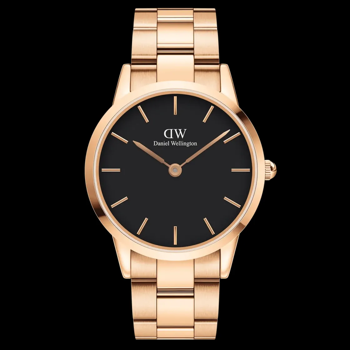 Montre de la collection Iconic Link, mouvement à quartz 2 aiguilles, cadran noir, boitier en acier doré rose sur bracelet acier doré rose sur une boucle déployante papillon.
