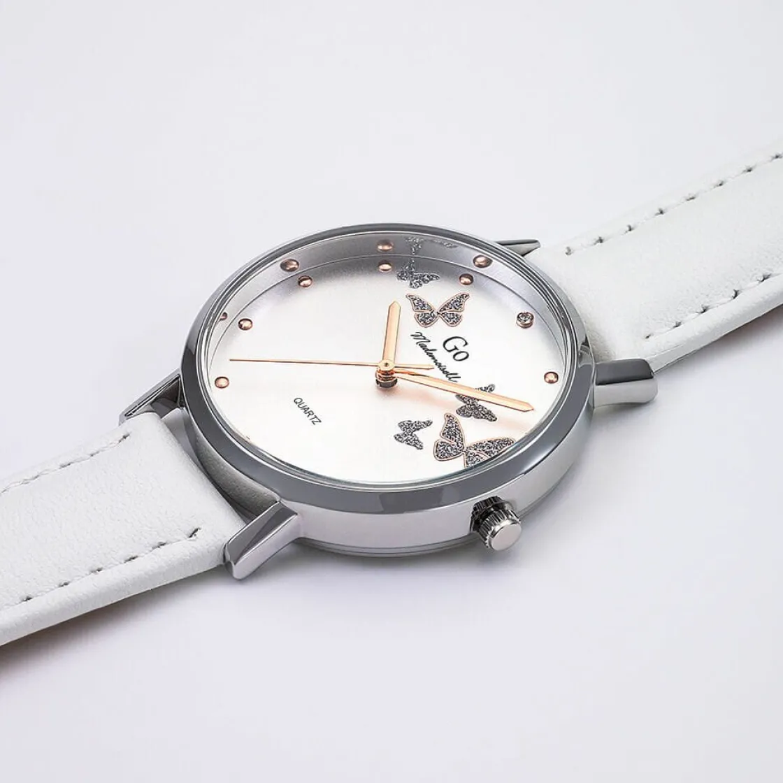 Montre de la marque GO, mouvement quartz 3 aiguilles, cadran argent, boitier acier sur bracelet cuir blanc.