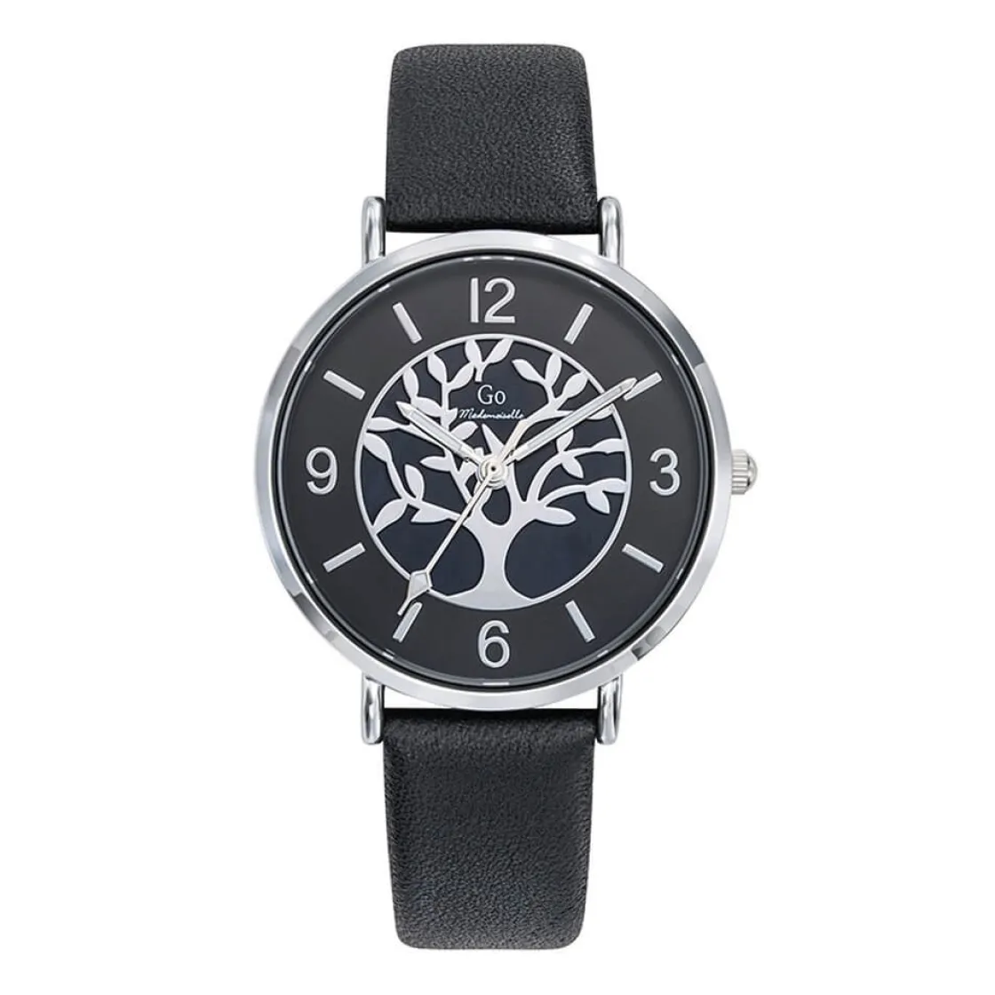 Montre de la marque GO, mouvement quartz 3 aiguilles, cadran noir avec motif arbre de vie, boitier acier sur bracelet cuir noir.