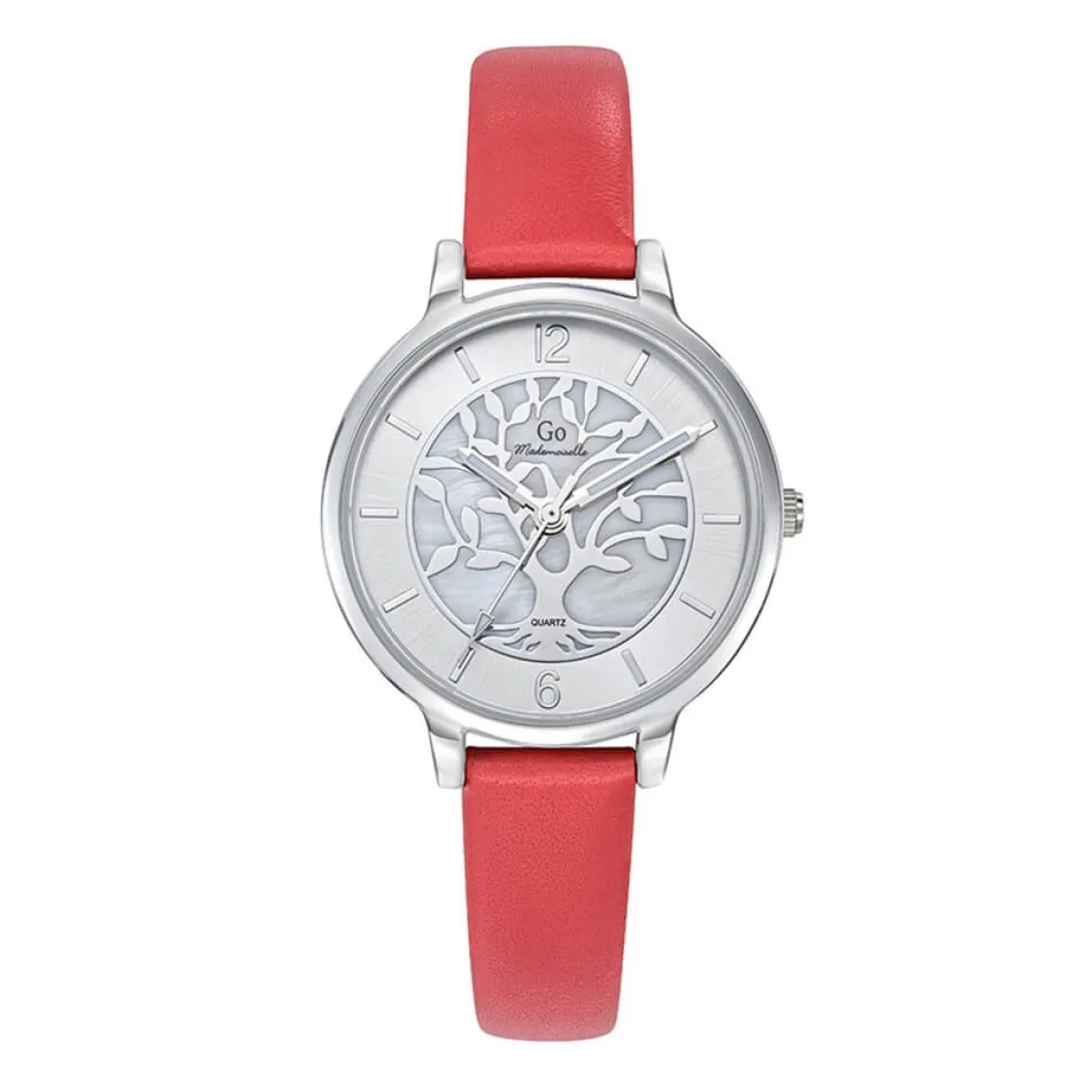 Montre de la marque GO, mouvement quartz 3 aiguilles, cadran argenté avec motif arbre de vie, boitier acier sur bracelet cuir rouge.