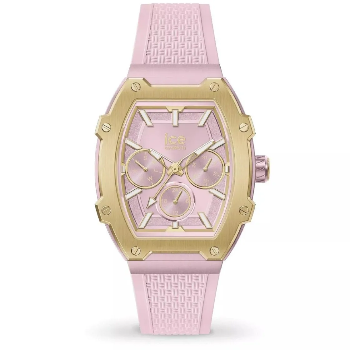 Montre de la collection Ice Boliday, mouvement quartz multifonctions, cadran rose, boitier aluminium rose sur bracelet silicone rose.