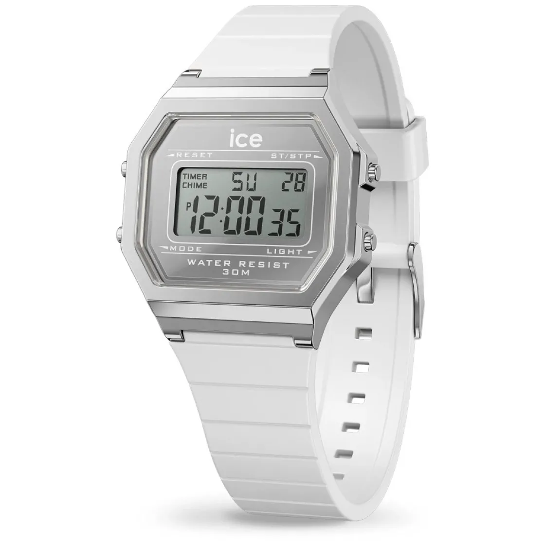 Montre de la collection Ice digit retro, mouvement quartz digital (chrono, alarme), cadran argenté , boitier acier sur bracelet silicone blanc.