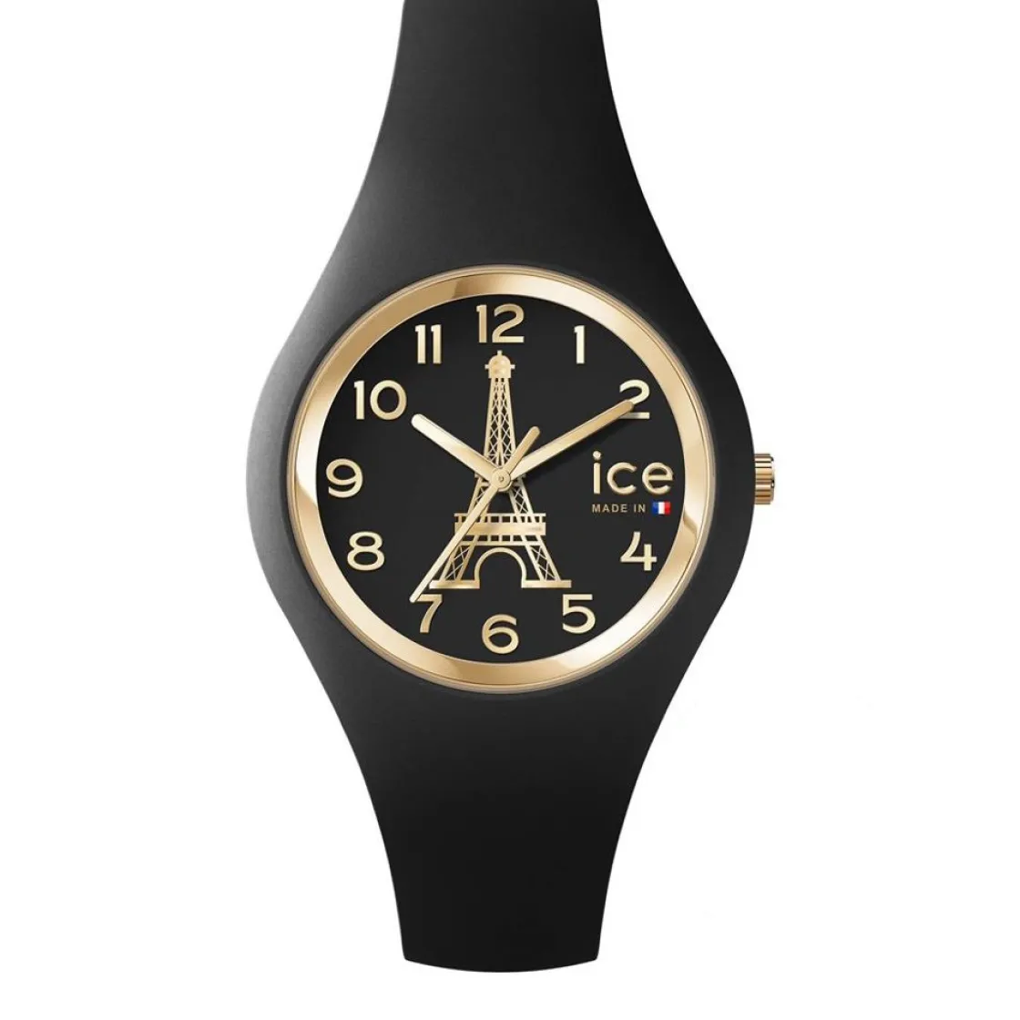 Montre de la collection Ice Cocorico, mouvement à quartz 3 aiguilles, cadran motif Tour Eiffel doré, boitier et bracelet silicone noir.