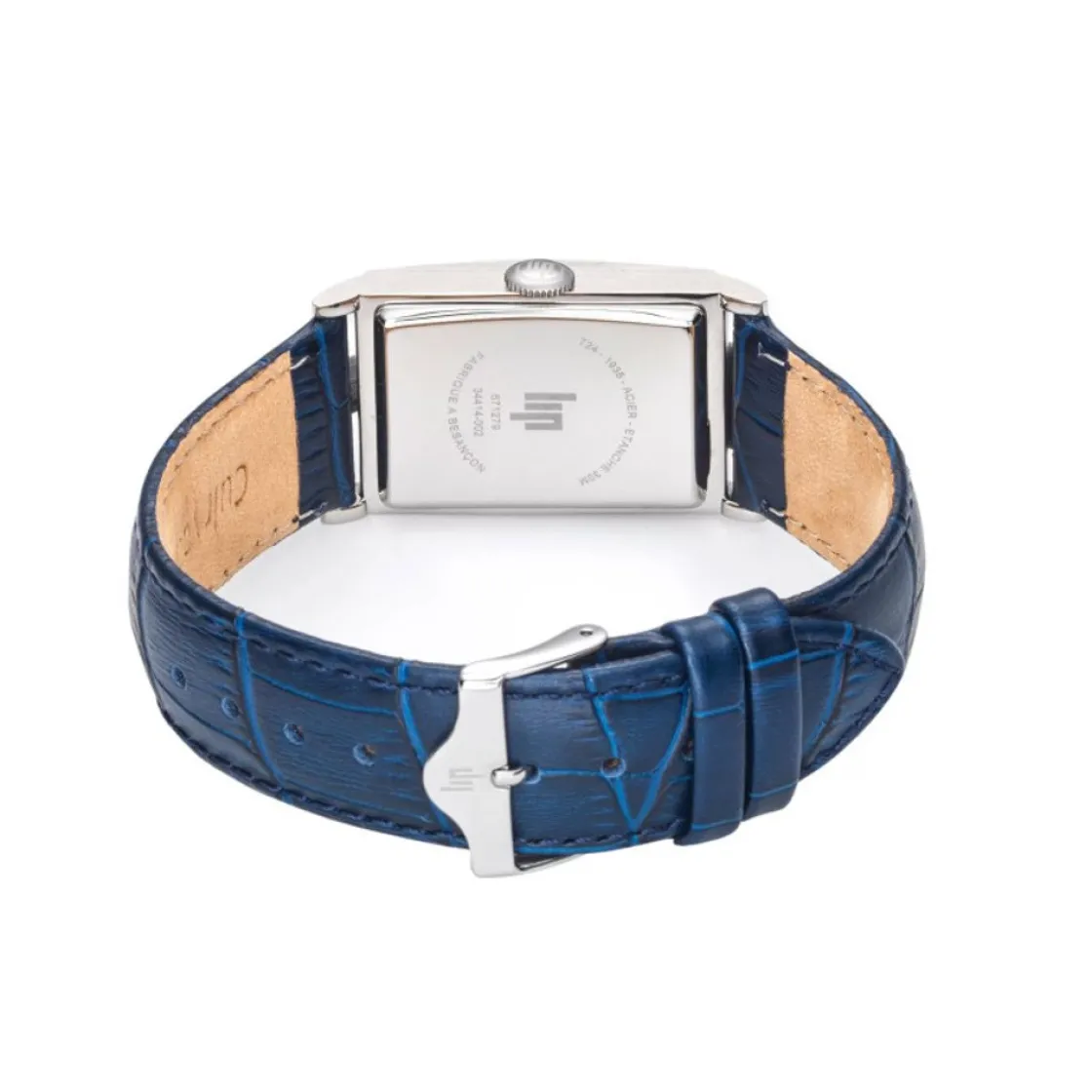 Cette montre LIP T24 est une déclinaison de la célèbre Lip T18 qui fut offerte à Winston Churchill après la guerre. Elle conserve donc cette esthétique vintage et intemporelle qui fit sa renommée. Dotée d’un boîtier en acier inoxydable poli et brossé de 41,5mm de longueur et 23,5 mm de largeur, elle conserve son look vintage et intemporel. Son magnifique cadran bénéficie d’une finition brossée verticalement et horizontalement aux deux teintes argentées, il accueille des aiguilles couleur bleue. Son bracelet en cuir bleu mat façon crocodile est surpiqué en ton sur ton et se ferme par une boucle ardillon. Un modèle classique qui joue la différence.