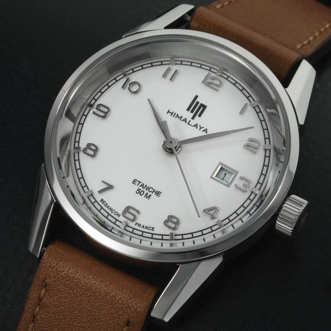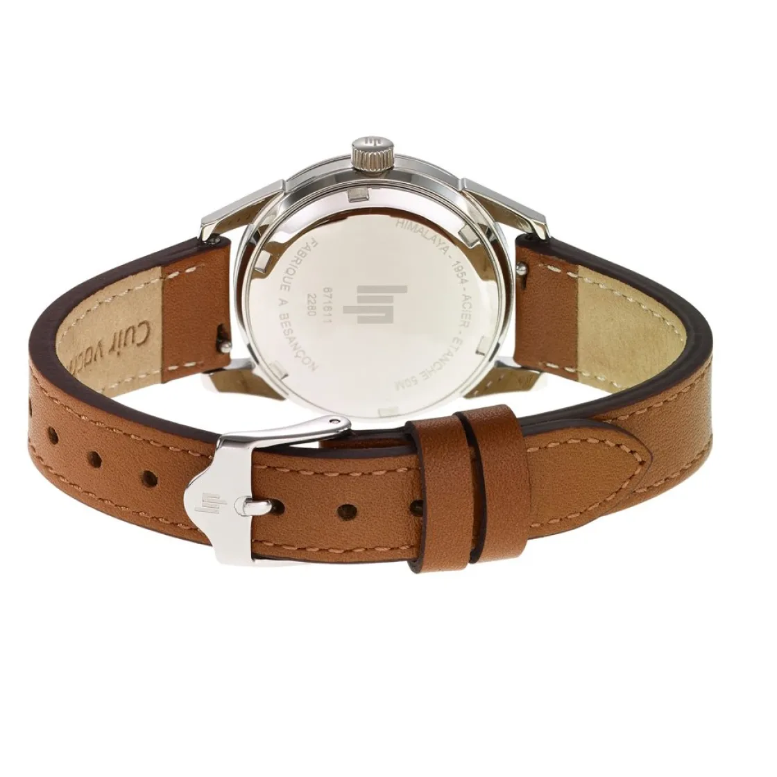 Montre de la collection Himalaya, mouvement quartz 2 aiguilles, dateur à 3h, cadran argenté, boitier acier sur bracelet acier cuir brun.