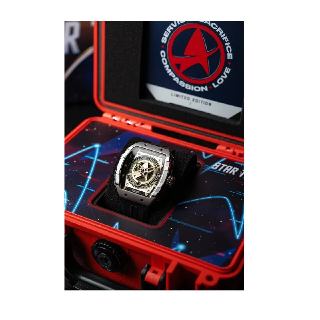 Montre de la collection Star Trek, mouvement automatique 3 aiguilles, cadran fantaisie bicolore , boitier acier sur bracelet silicone brun.
