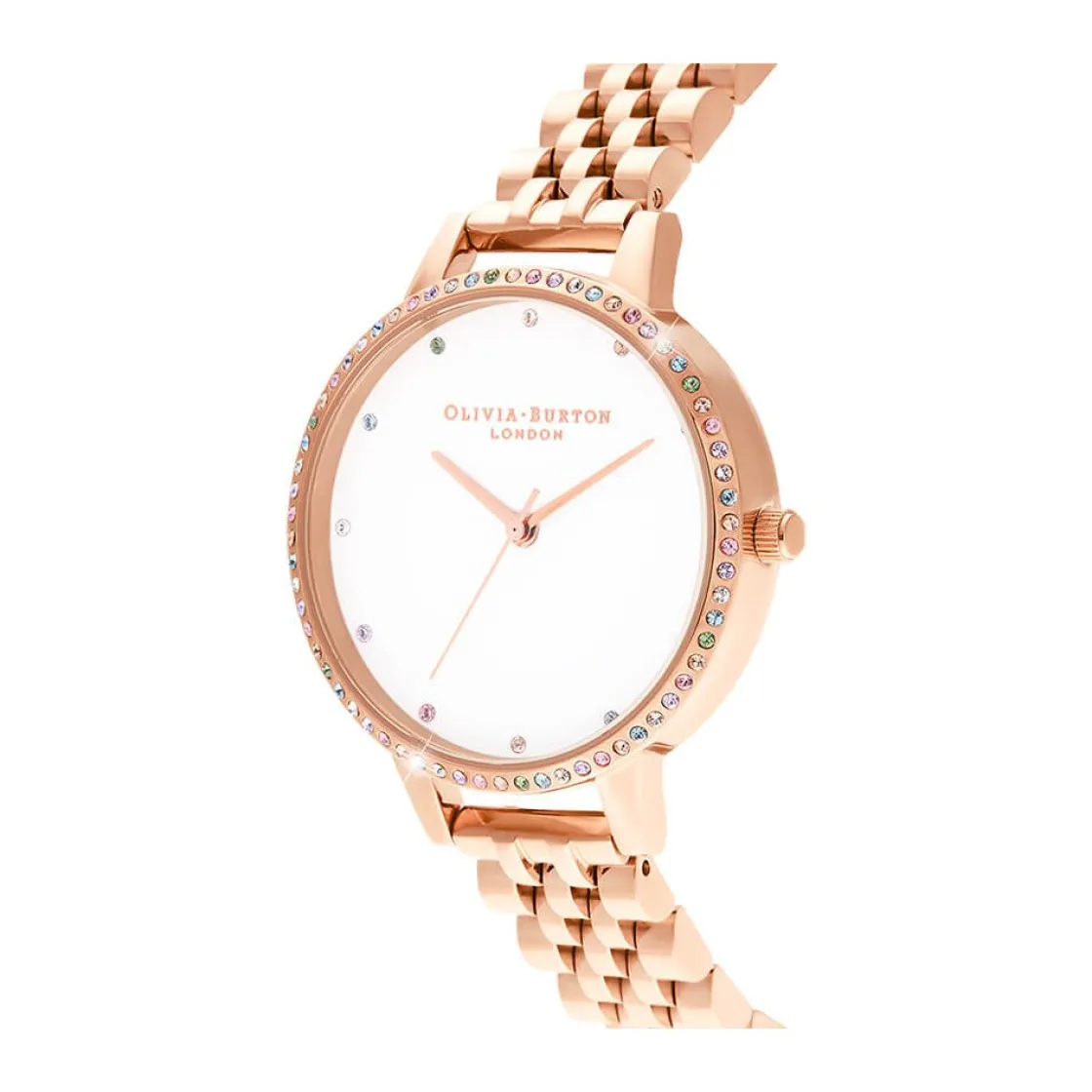 Montre de la collection Rainbow, mouvement quartz 3 aiguilles, boitier en acier doré rose, lunette sertie de pierres multicolores avec un cadran blanc sur bracelet en acier doré rose.